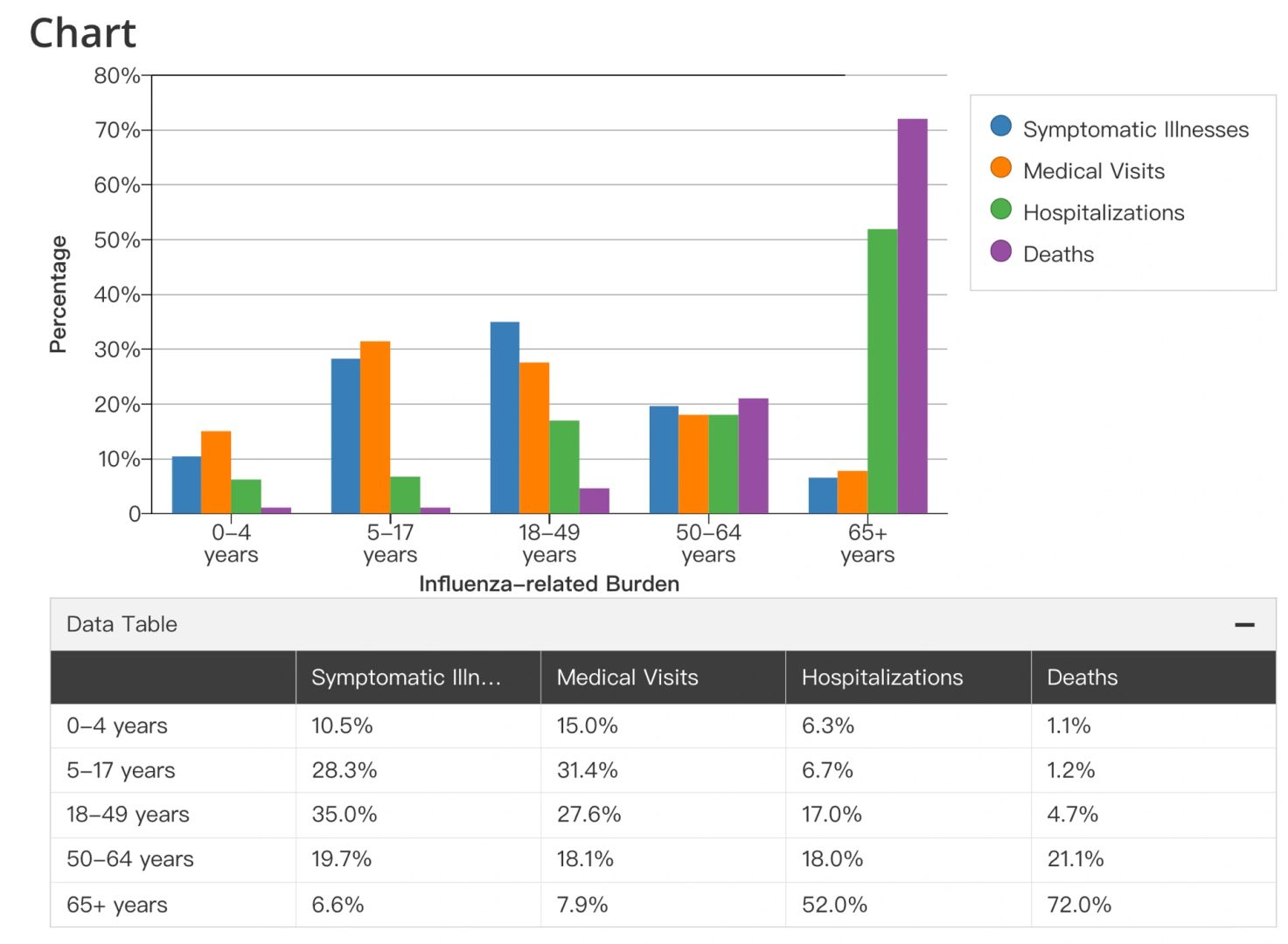 但无论是哪一年,最容易出现有症状流感的人群基本是0~4岁儿童。而住院率和死亡率最高的是65岁及以上老年人,他们患流感后的住院风险大约是0~4岁儿童的14倍,死亡风险则大约是100倍。
