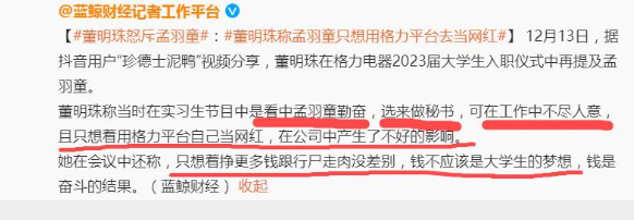 董明珠再怼孟羽童!称其只是想利用格力平台当网红!而且在公司造成了不好的影响,好家伙,看得出来,董小姐对孟羽童还是耿耿于怀啊,难怪能力强又敬业还不看工资条的王自如,能深得董明珠赏识,人和人总是有差距的,有的是就是想出名当网红,而有的人就是想做事干出一番成绩的,不过,有个问题值得深思,你们觉得董小姐针对离职一段时间的前员工加以点评,合不合适呢?