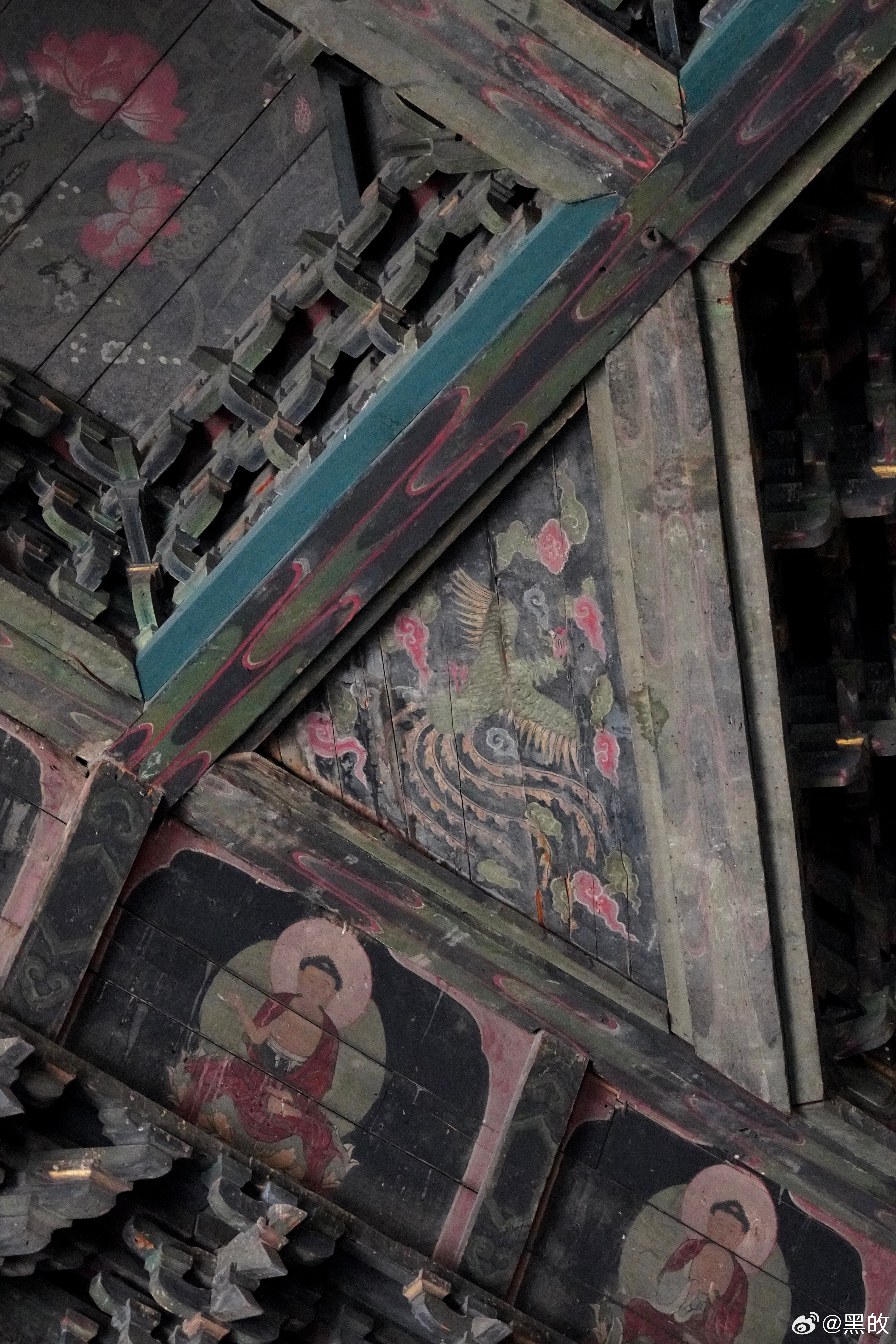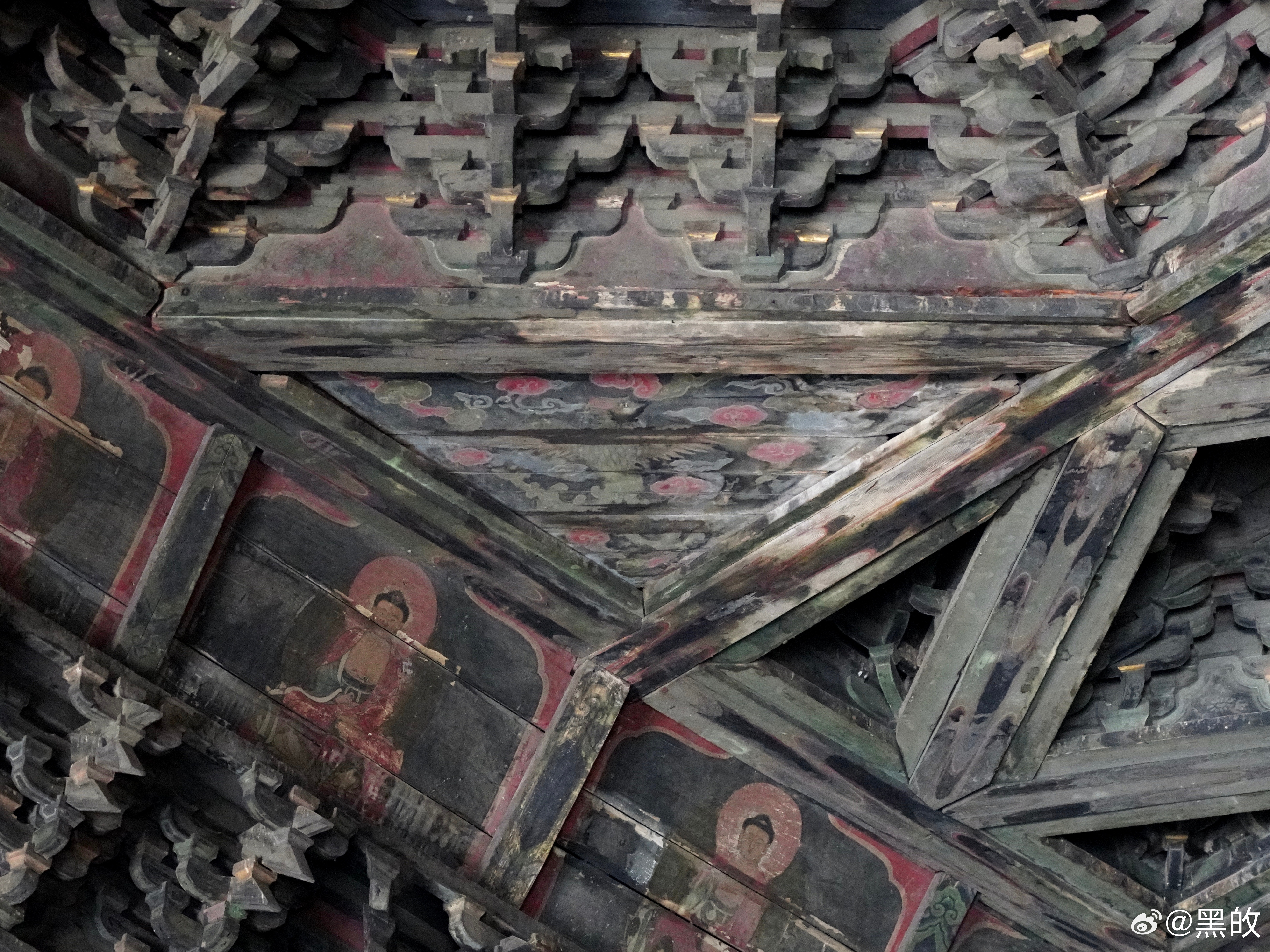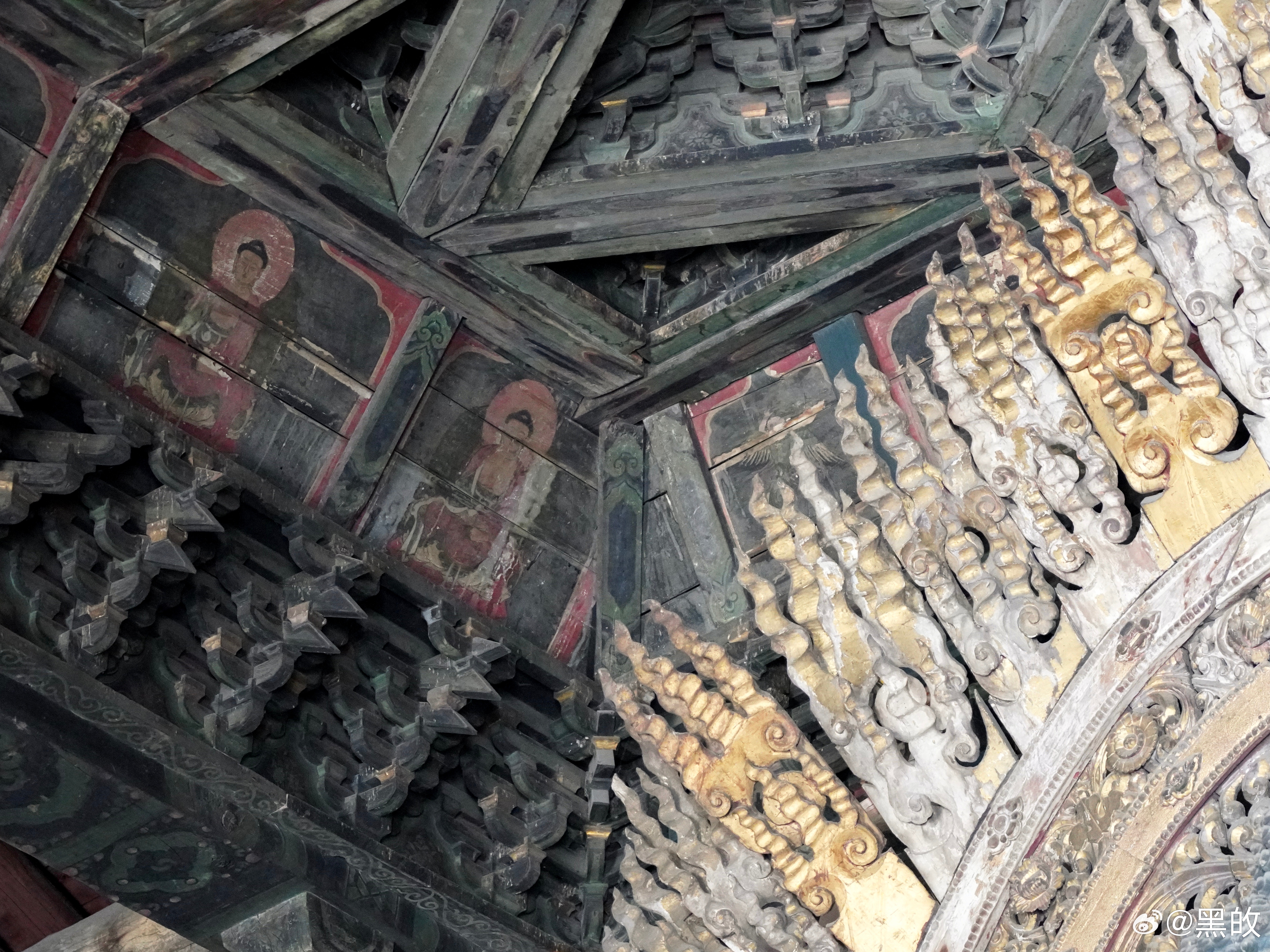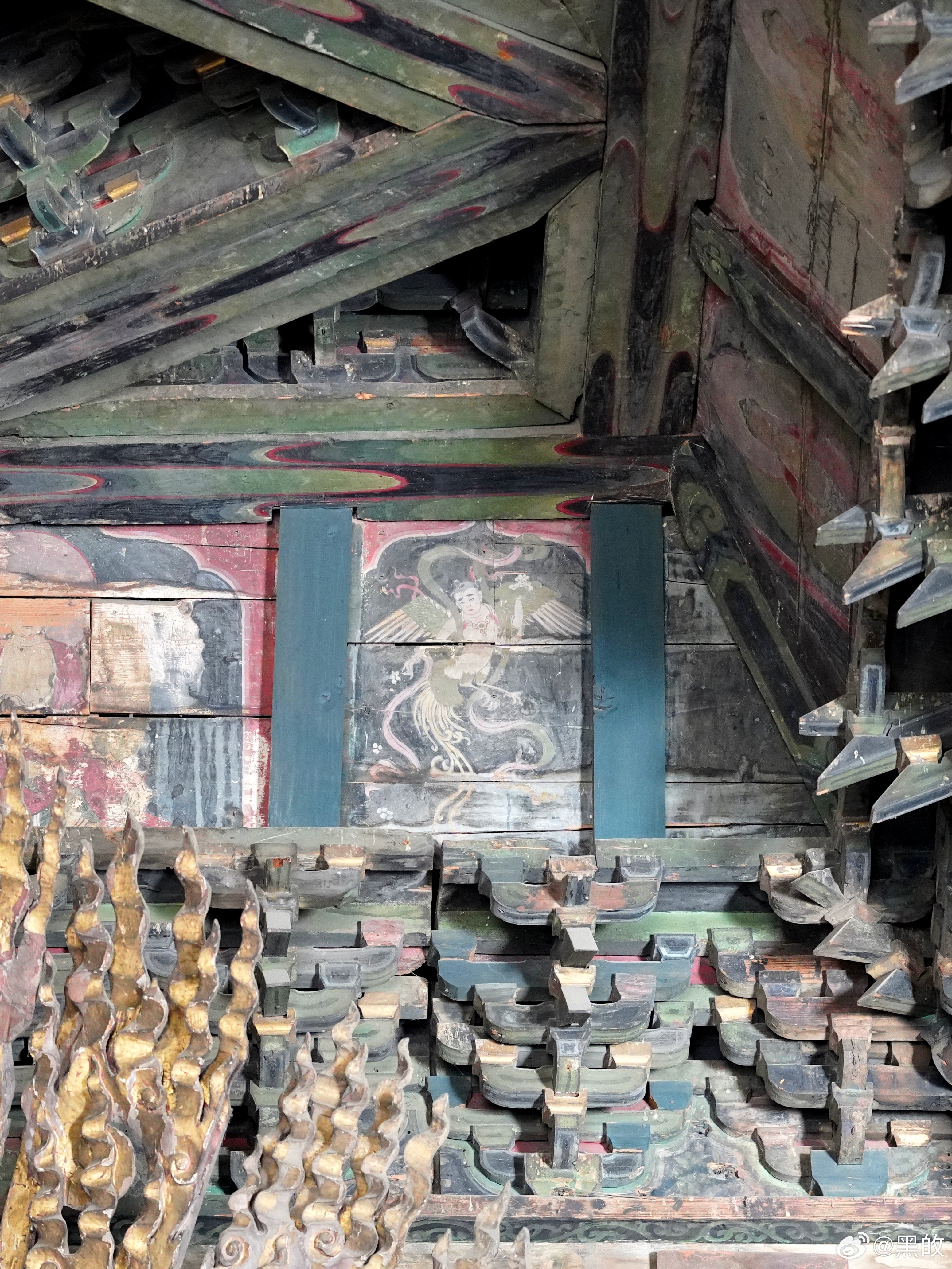 位于大殿正中毗卢遮那佛上方,有平棊藻井两间,辽代小木作遗存,彩画也颇为精彩,部分地方为明代修补重描