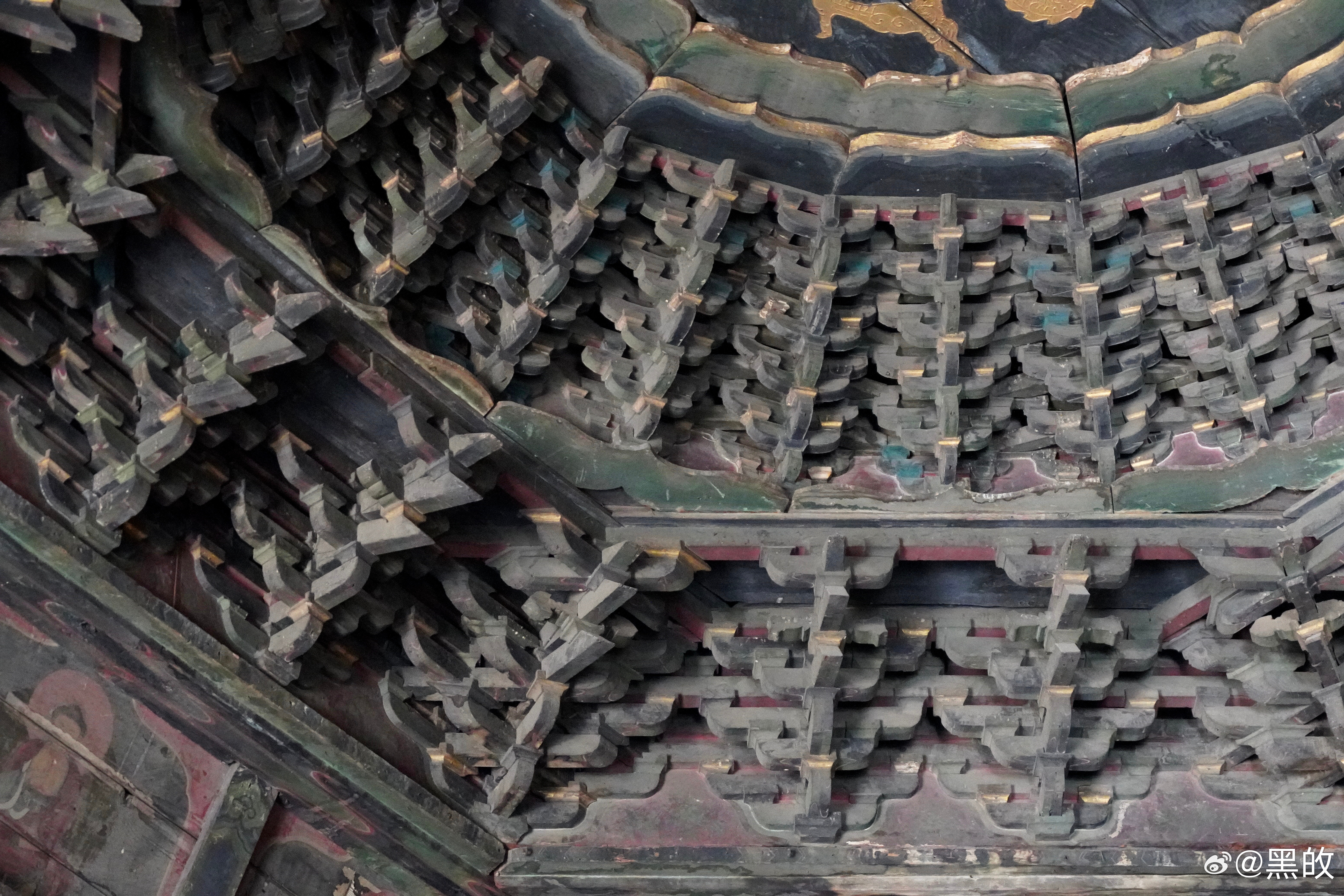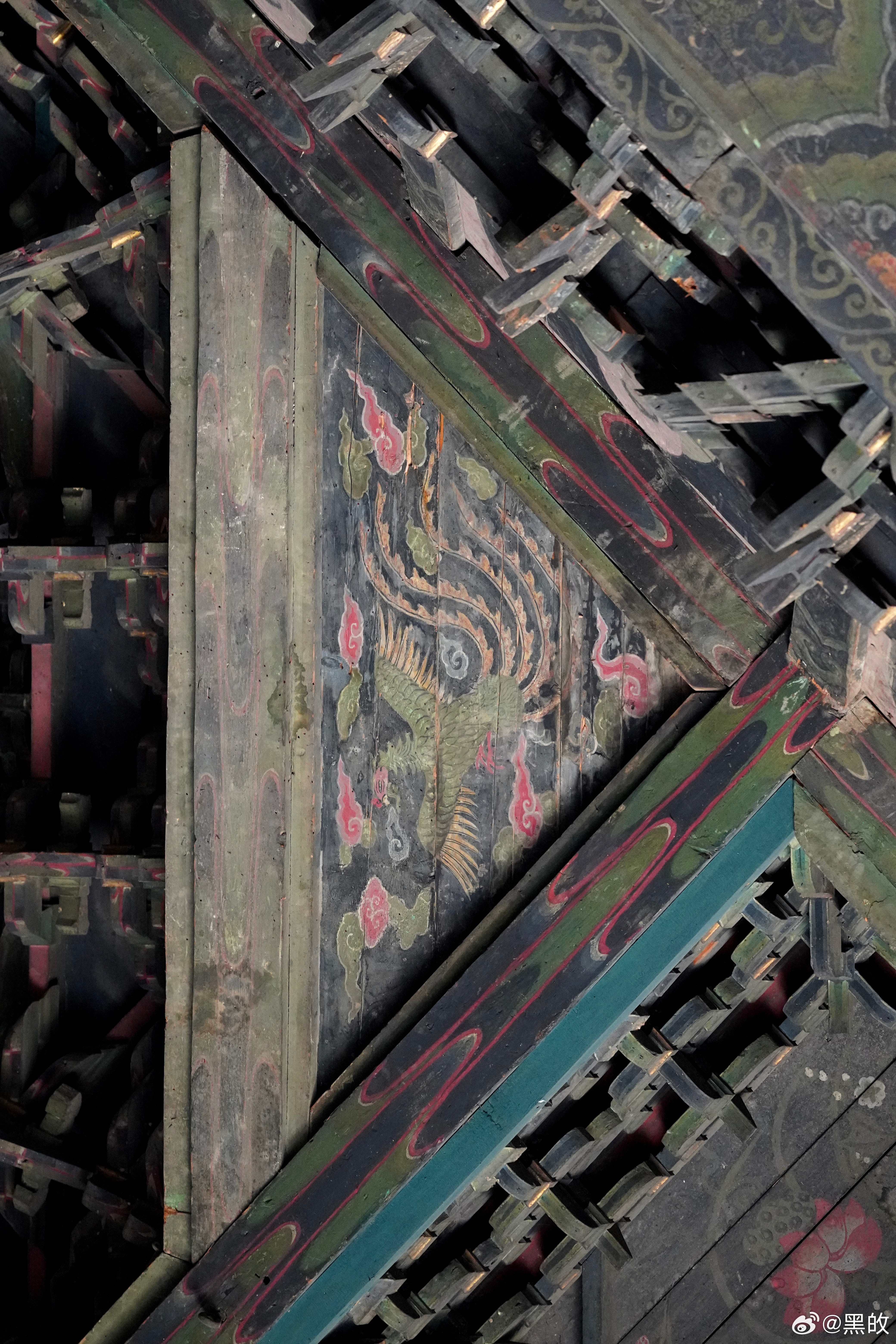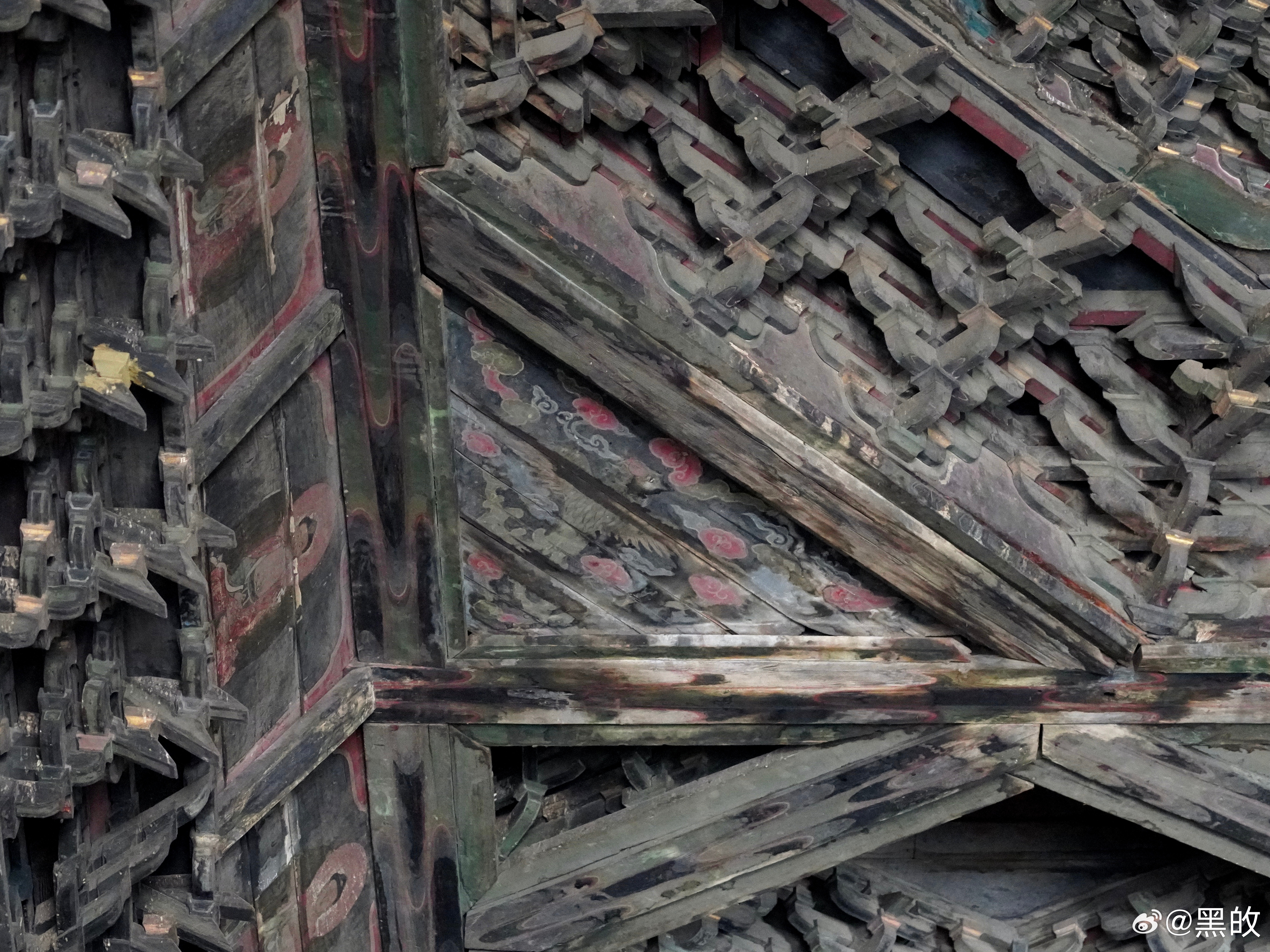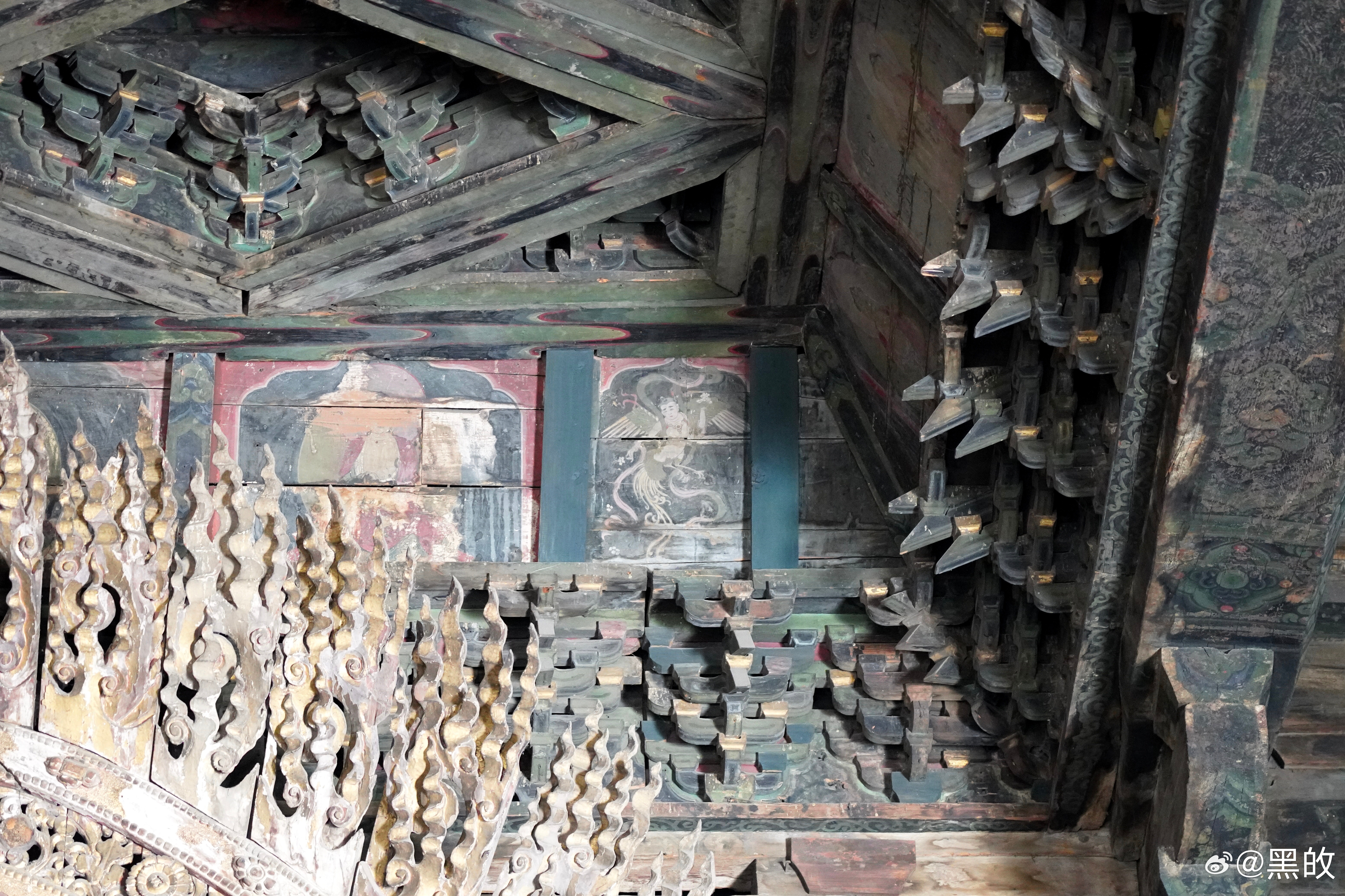 位于大殿正中毗卢遮那佛上方,有平棊藻井两间,辽代小木作遗存,彩画也颇为精彩,部分地方为明代修补重描
