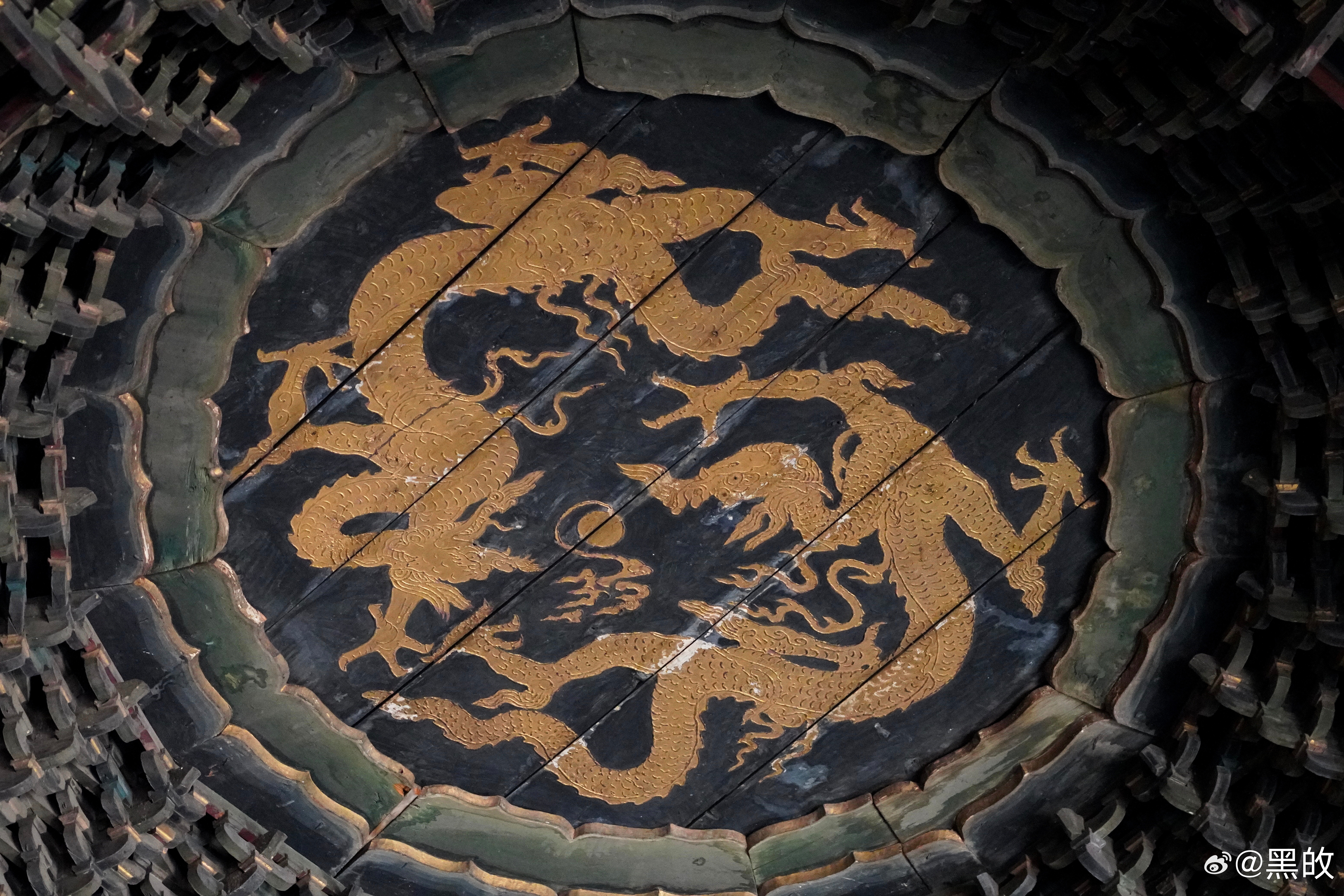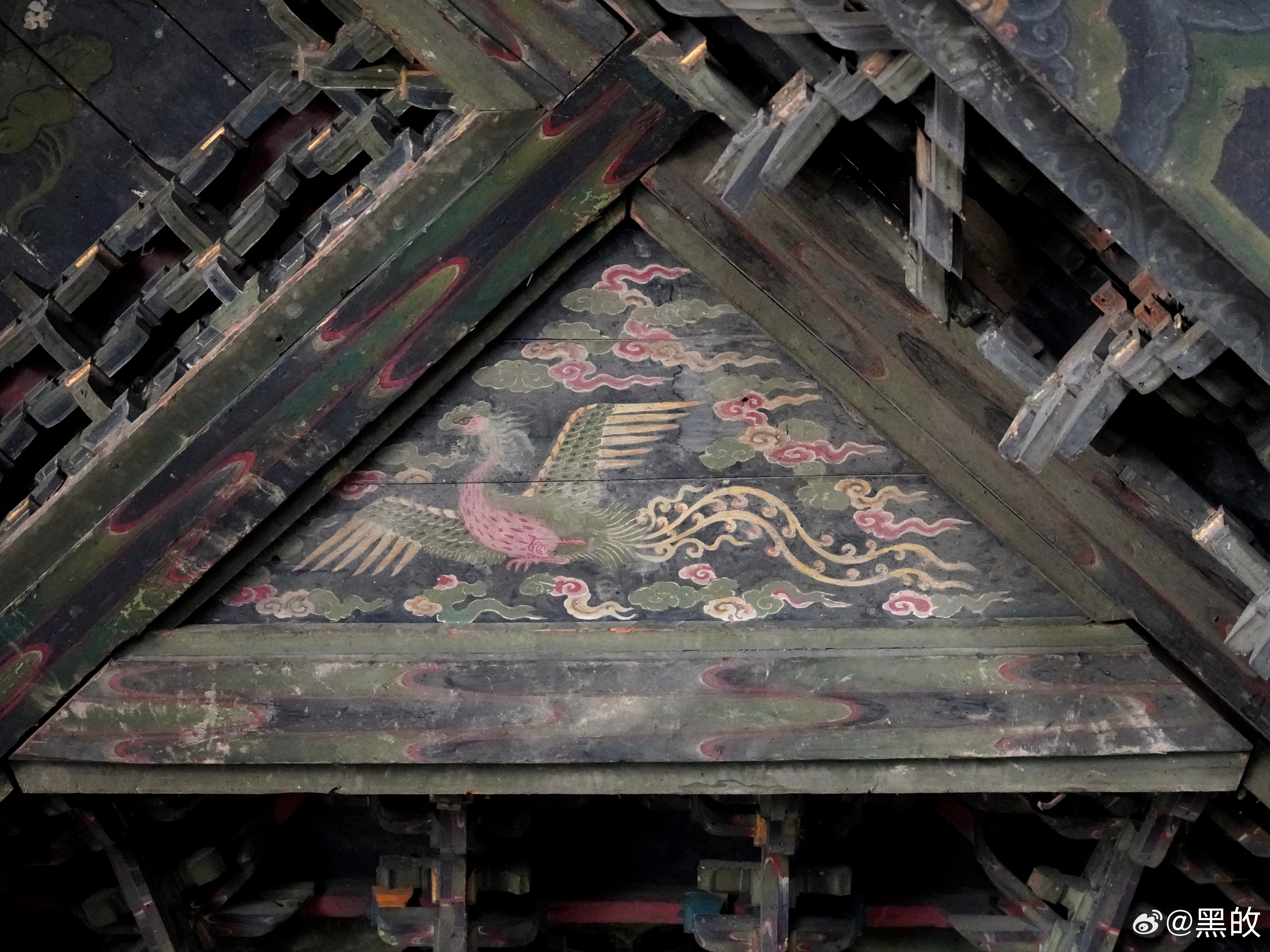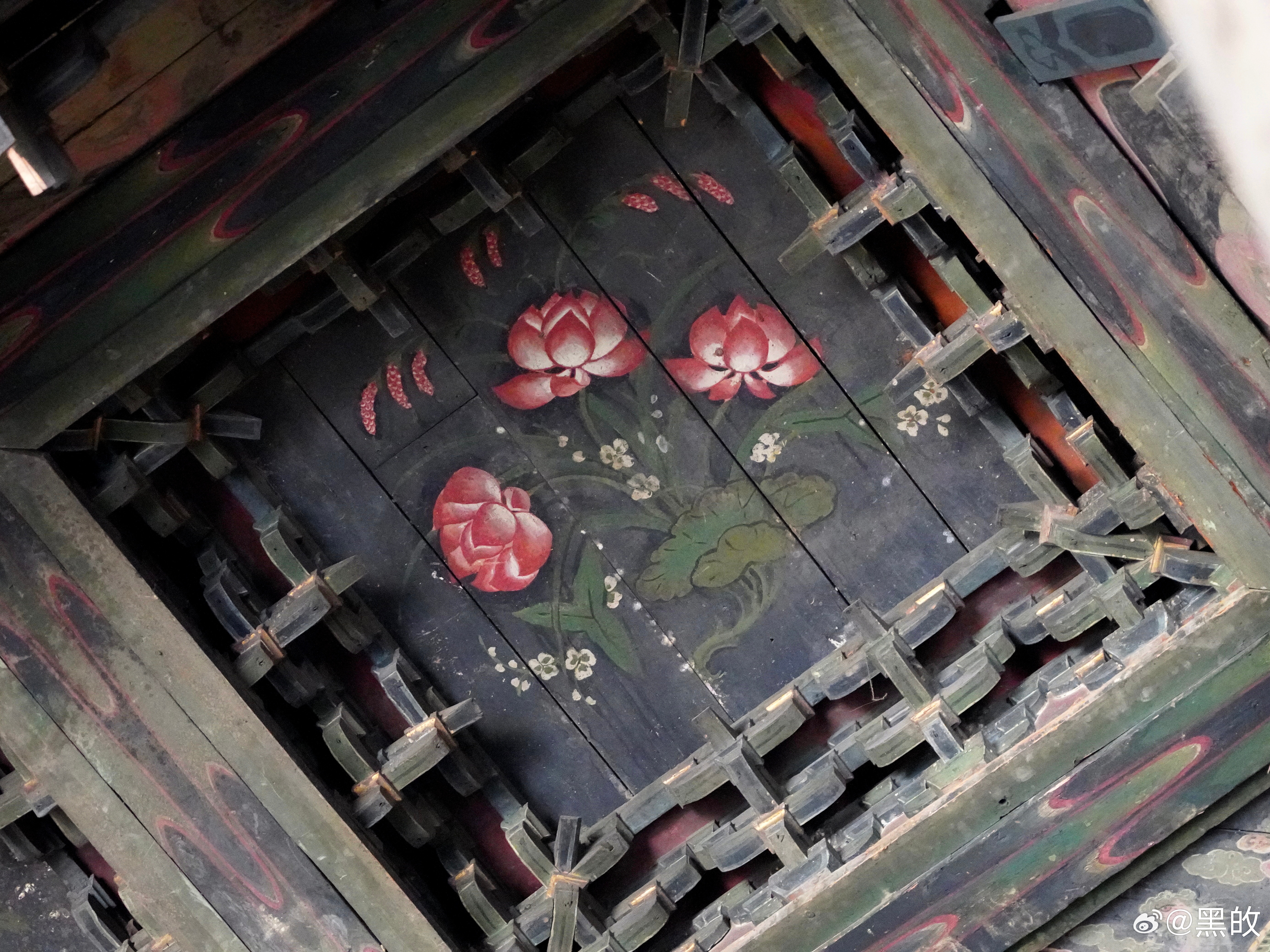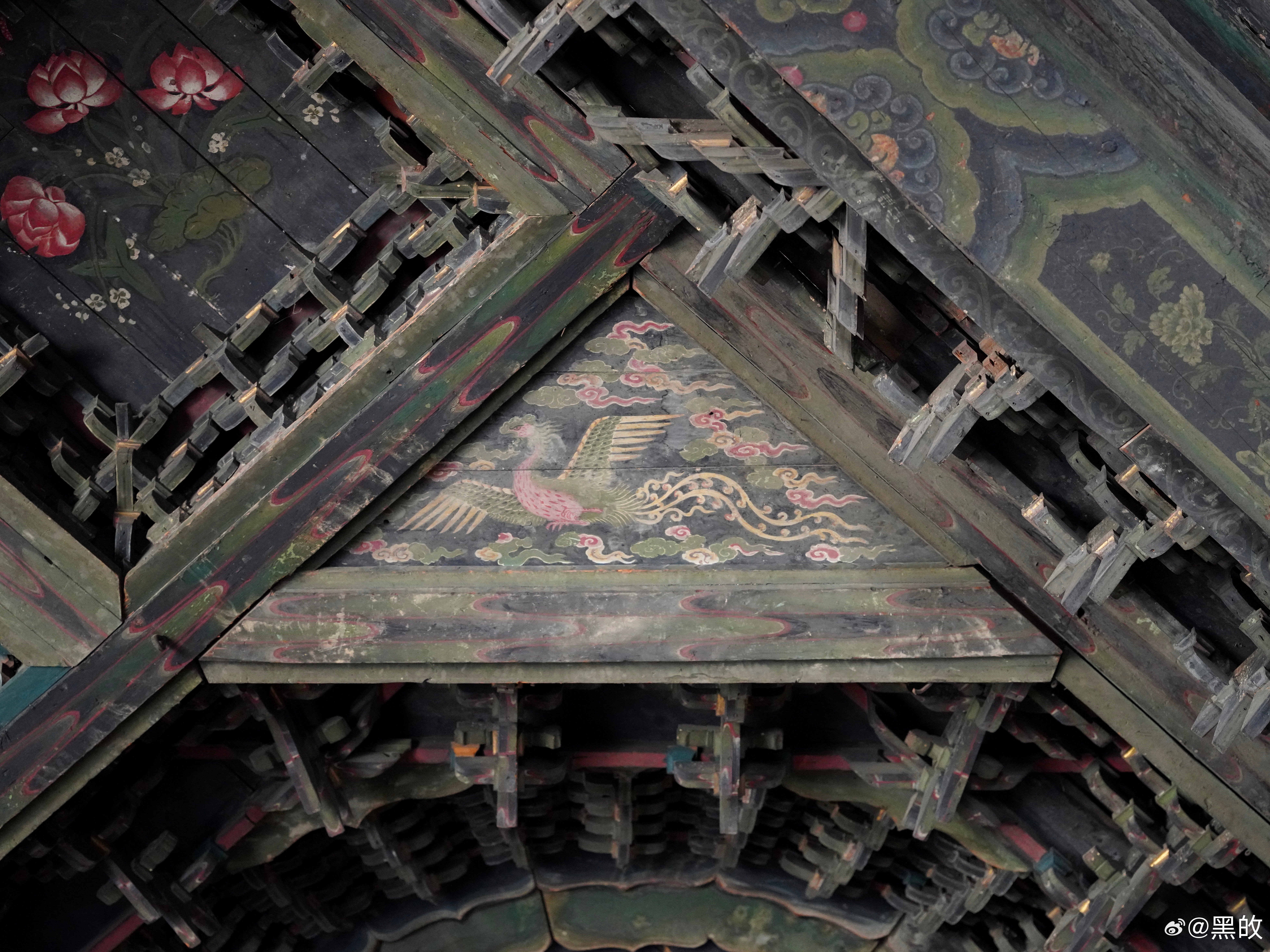 位于大殿正中毗卢遮那佛上方,有平棊藻井两间,辽代小木作遗存,彩画也颇为精彩,部分地方为明代修补重描