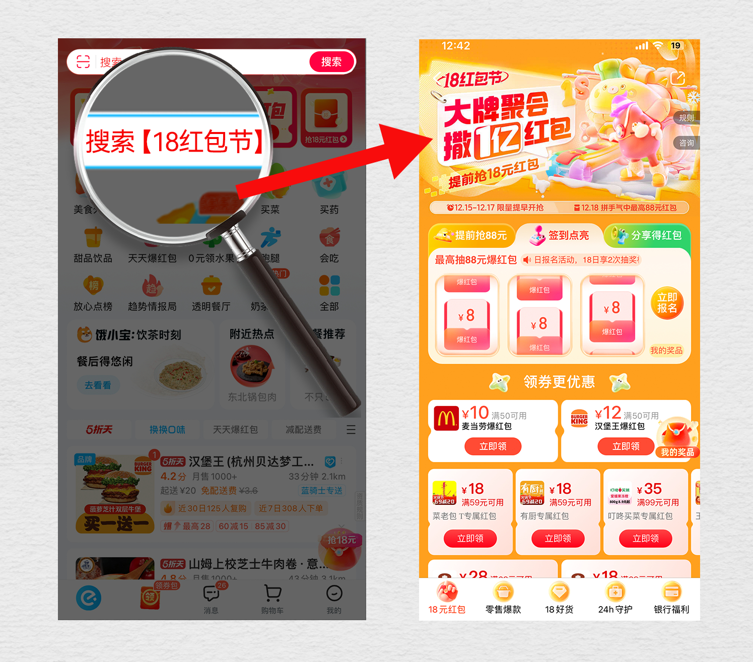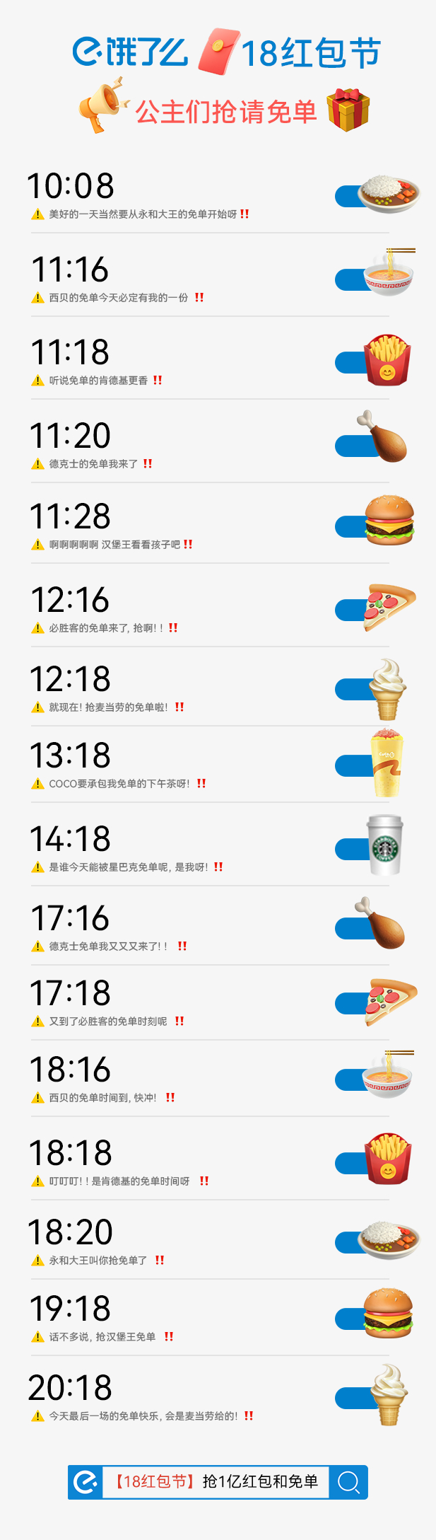 饿了么永远不会让人失望!不知不觉已经是今年的最后一个#饿了么18红包节#了,没想到饿了么是一点鱼不摸,依旧带来最精彩的福利!上饿了么搜【18红包节】,抢等9大品牌16场免单专场,全天抽1亿红包和肯德基限定帆布包、必胜客超级响叮当、麦当劳徽章/帆布袋限量礼物。#饿了么18红包节大牌年终聚会#,真的是太给力了[哇]