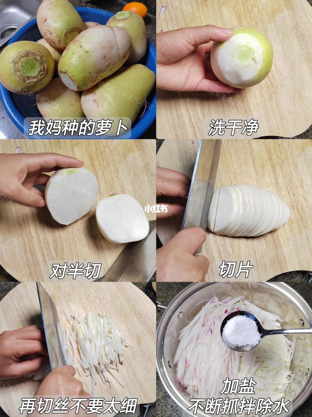 ⚠️三个萝卜,加了60克盐除水,所以要清洗一下,不然很咸哟!清洗后,尝尝咸度,合适就不加盐,咸了就再洗,不够咸就加少许盐调味即可!