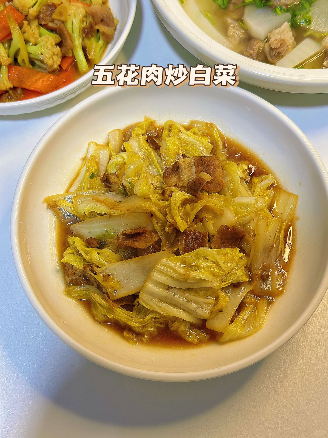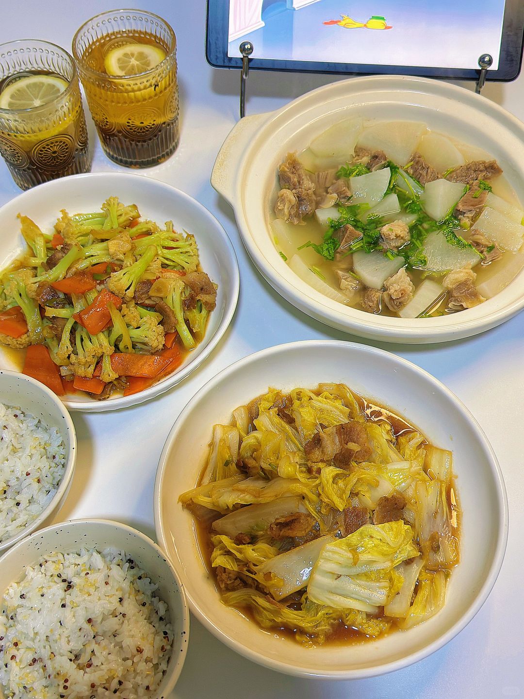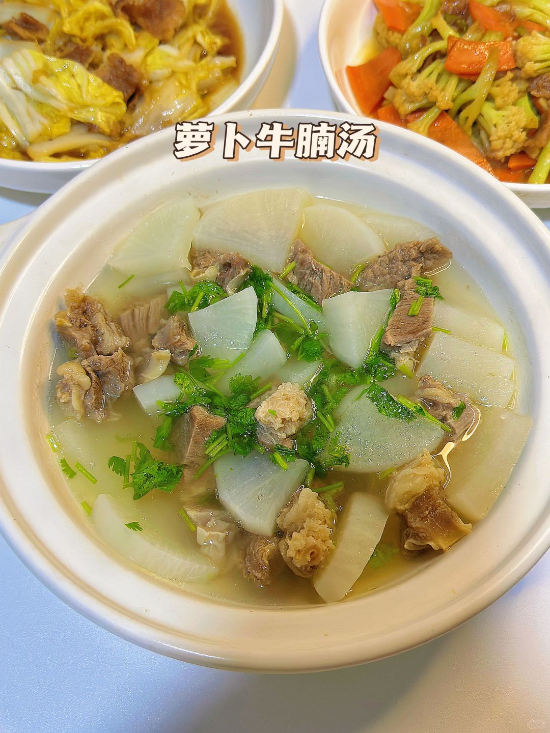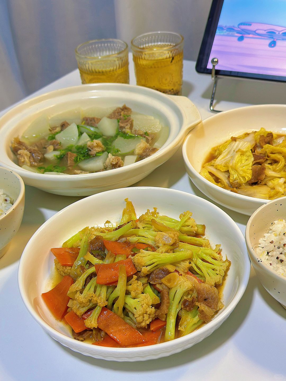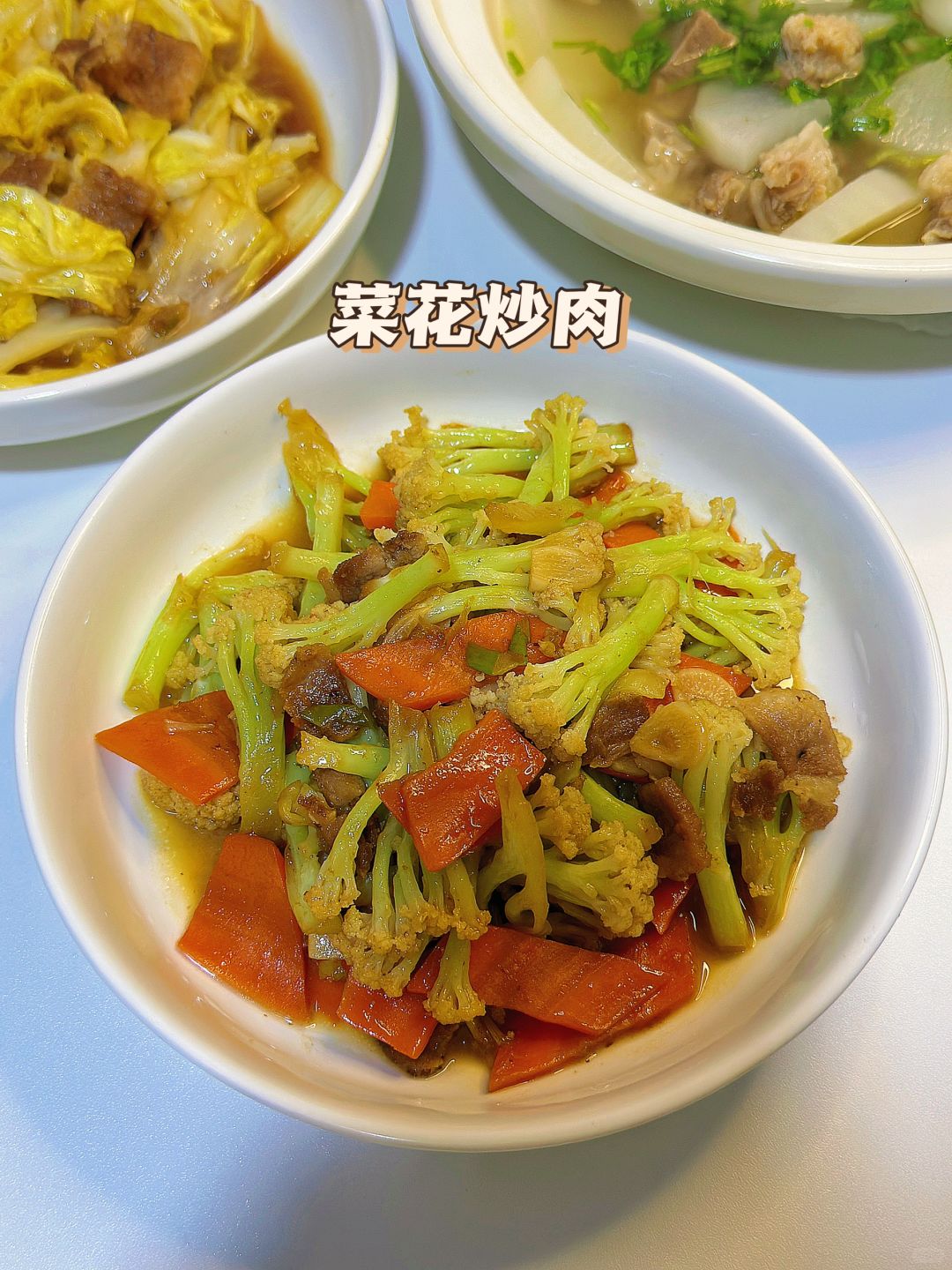 🎊冬天喝一口热乎乎的汤简直美呆了,萝卜甜甜的超爽口,想吃盒饭里那种不脆的菜花,查了一下要焖一会儿,完美复刻!太好吃啦~ 🌈今日菜单: 1️⃣萝卜牛腩汤 2️⃣菜花炒肉 3️⃣五花肉炒白菜