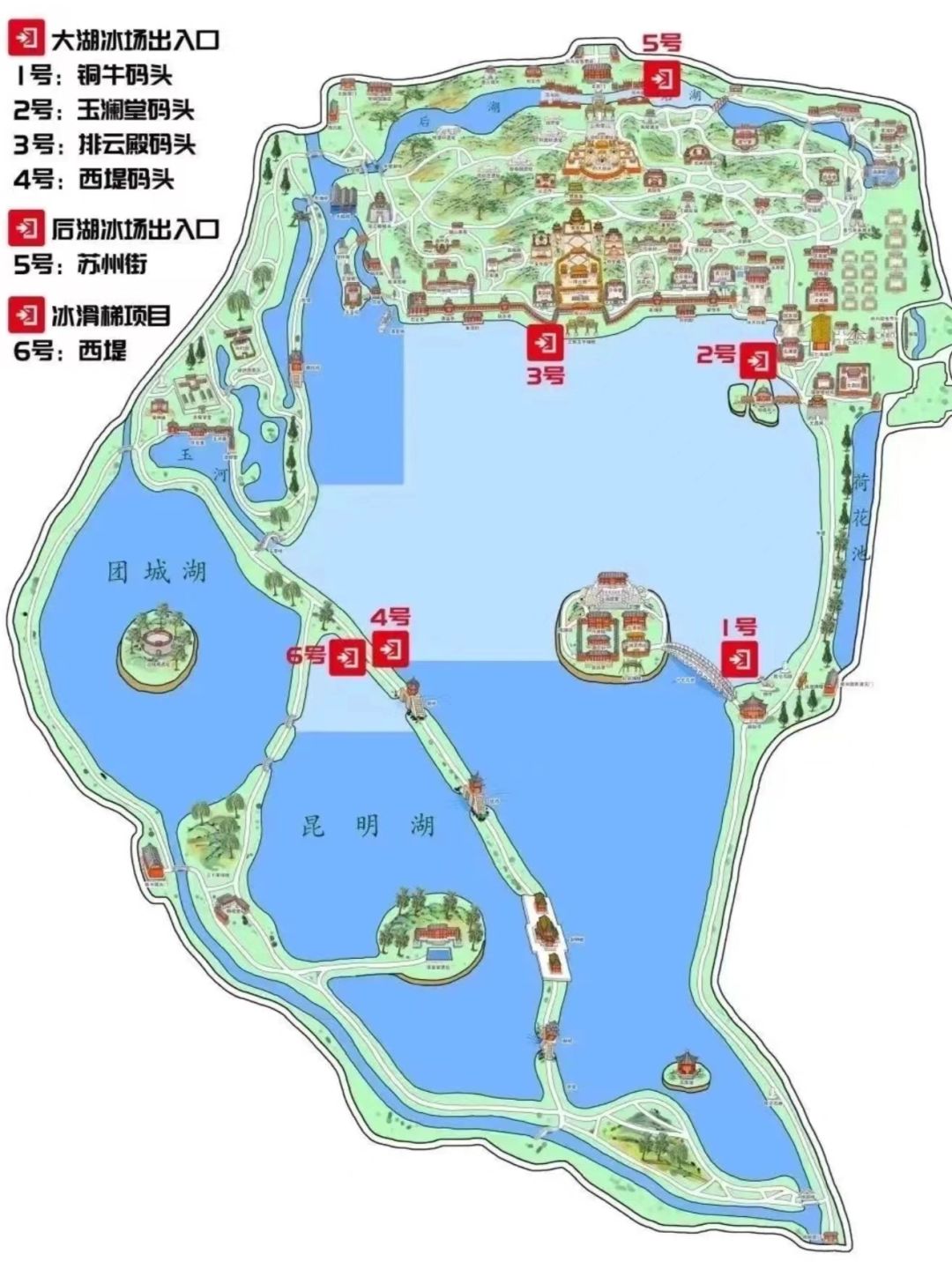 ▫昆明湖区域冰场入口4 处,分别为铜牛码头、玉澜堂码头、排云殿码头和西堤码头