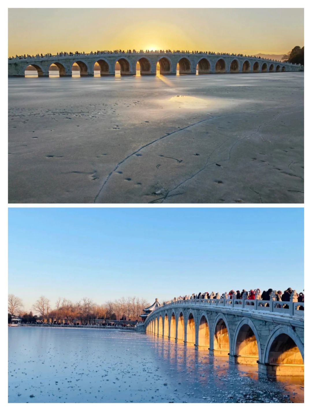 ▫傍晚可以在冰面赏夕阳,有机会拍到十七孔桥的“金光穿洞”美景