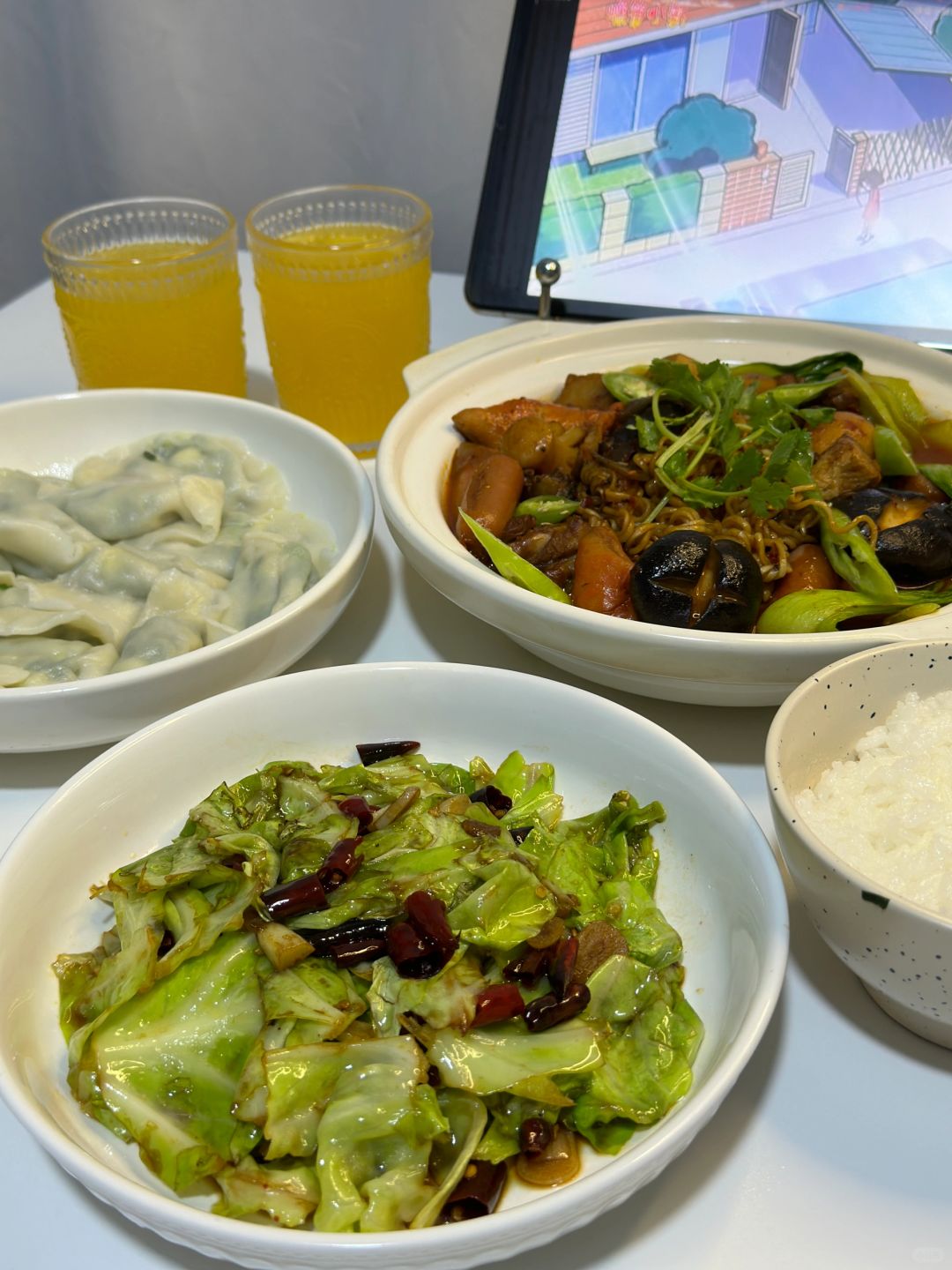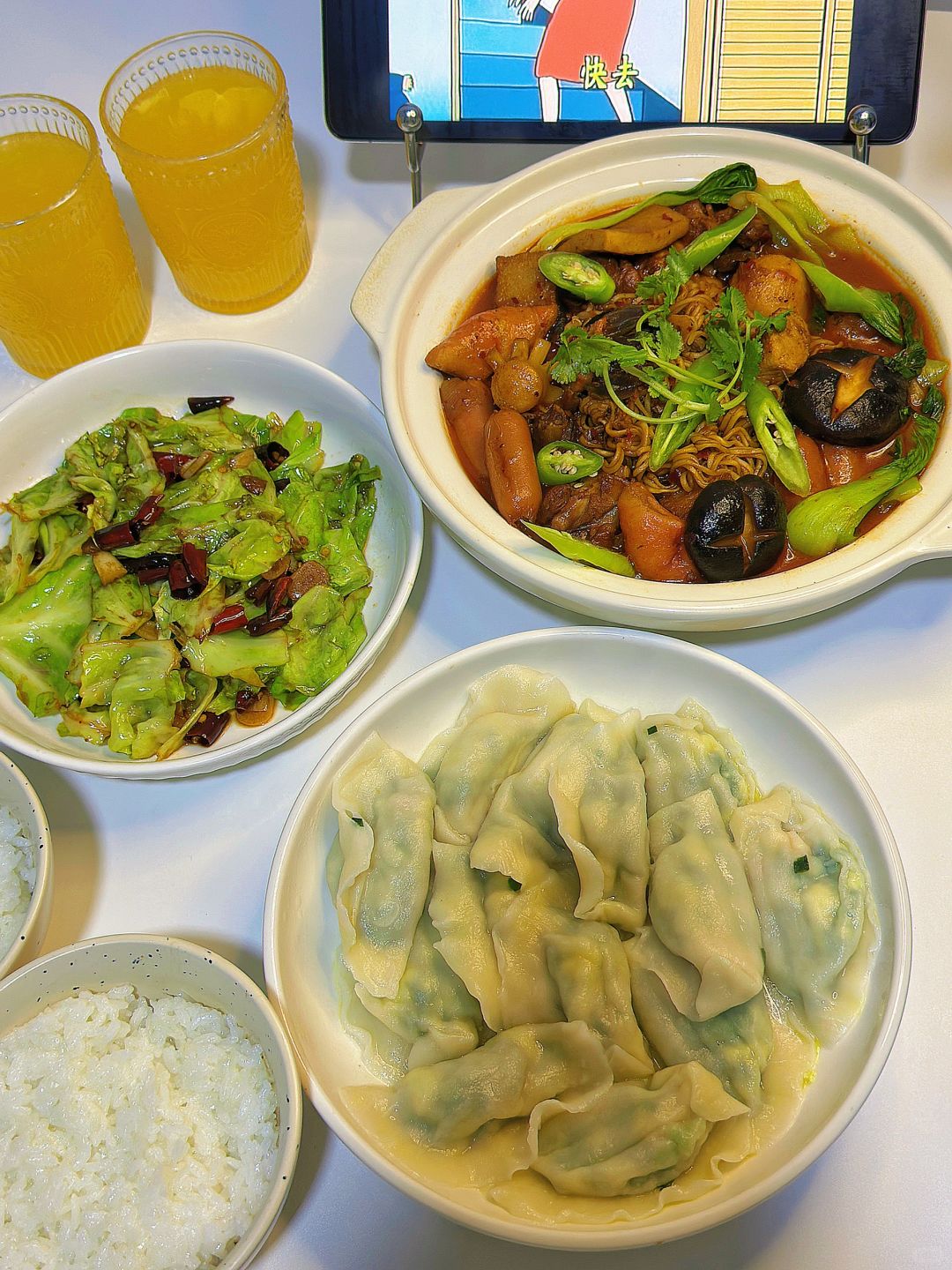 🎊今天冬至,要吃饺子哦~饭搭子买了生包饺子,回来煮一下就好啦!鸡公煲太好吃了~ 🌈今日菜单: 1️⃣鸡公煲 2️⃣手撕包菜 3️⃣饺子🥟