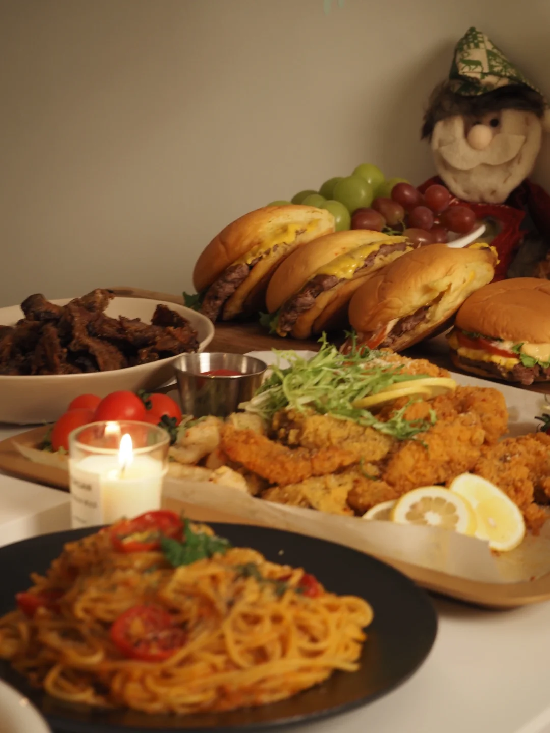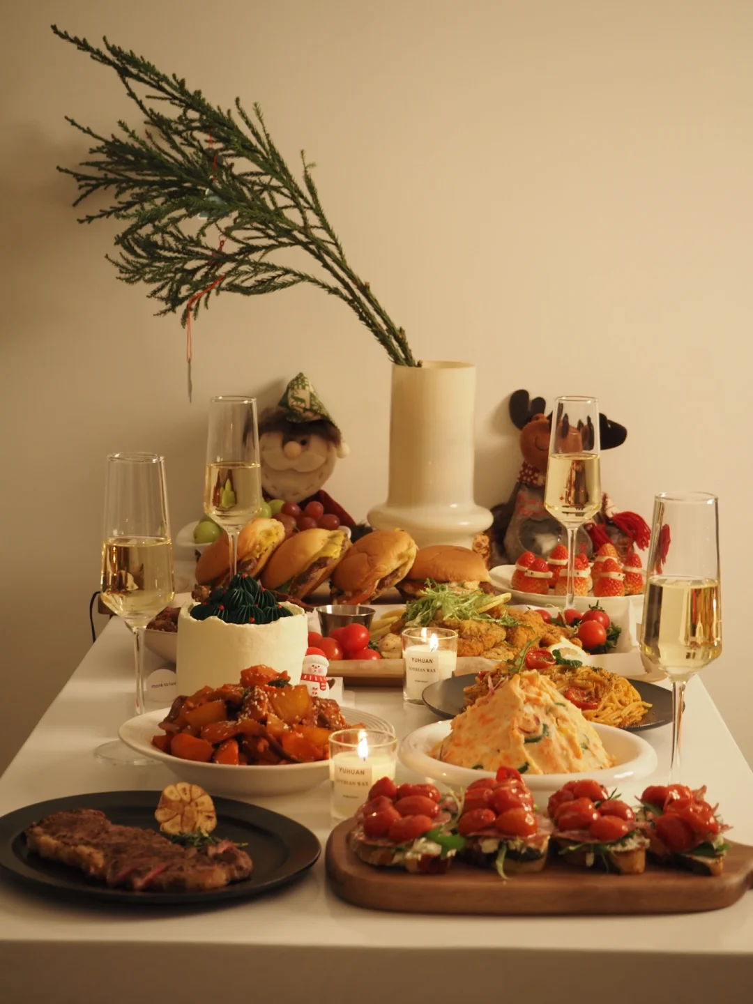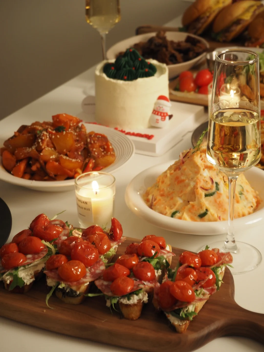 难得三五好友一起聚餐 宅家圣诞趴氛围感直接拉满~🤓 🎄圣诞菜单: ❶番茄肉酱意面 ❷牛肉芝士汉堡 ❸炸鸡拼盘 ❹韩式炖鸡 ❺土豆泥 ❻西冷牛排 ❼雪人草莓 ❽油浸小番茄萨拉米开放式欧包 ❾雪人蛋糕 (:Merry christmas🎄🎅🏻