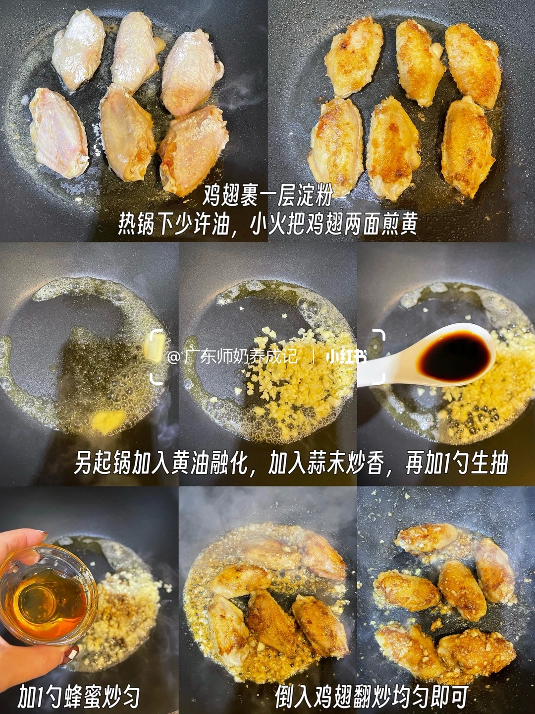 3️⃣起锅加入黄油融化,倒入蒜末炒香,➕1勺生抽➕1勺蜂蜜炒炒,倒入鸡翅翻炒均匀即可✅✅✅