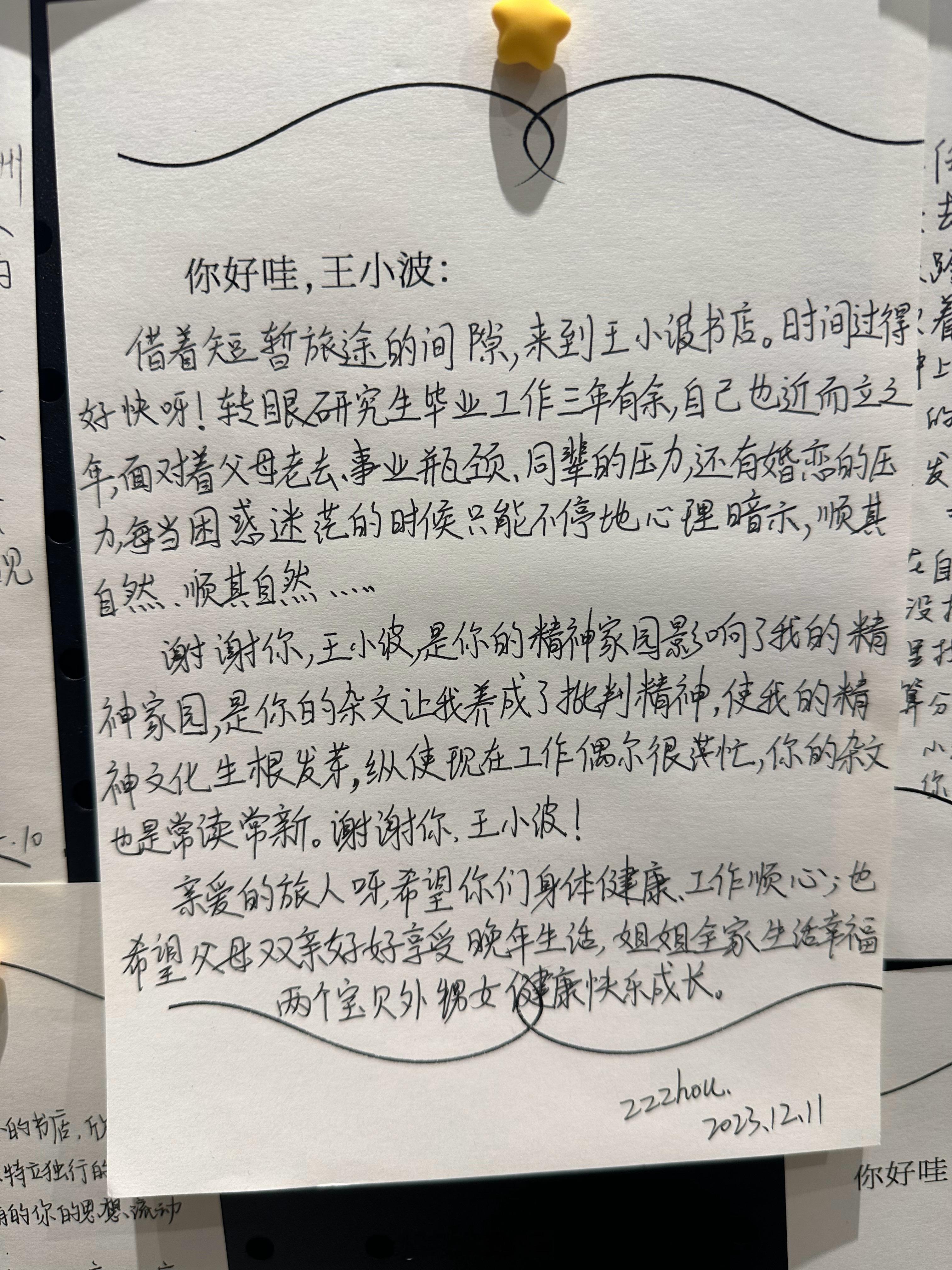 角落里,有个王小波留言区,我驻足很久,看着那些精致美好的字迹,大多是20岁左右的大学生,感受到一股迷茫和对生命深思的无果。忍不住,流下眼……是随喜赞叹,体察生命渺小却依然向阳而生。