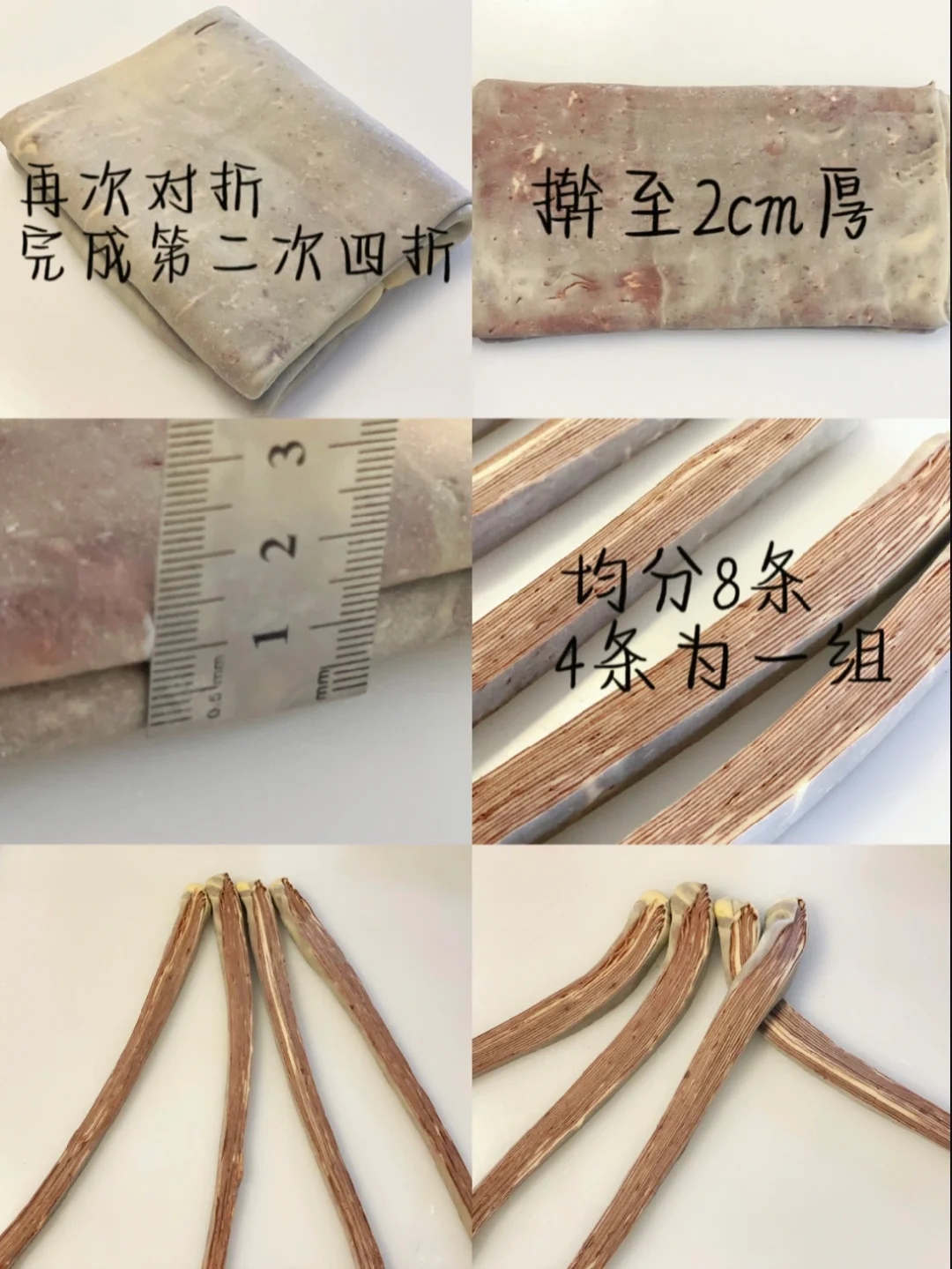 9⃣️擀至2cm厚度;均分八条,四条为一组,每组重量应几乎一致。