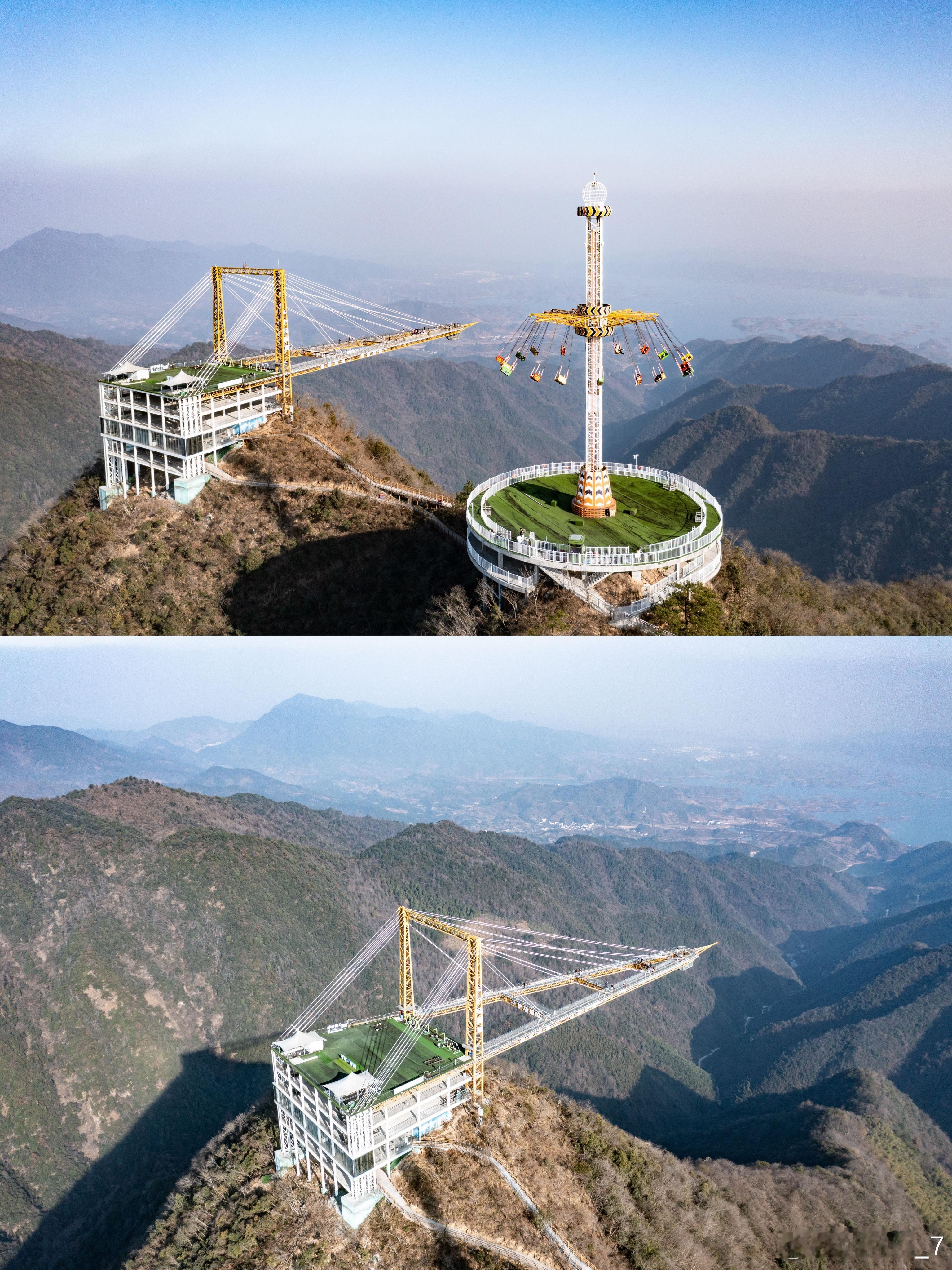 山顶可以一览千岛湖“千岛千山”风光,还有更加刺激的空中悬挑玻璃观景长廊以及网红高空秋千等项目。