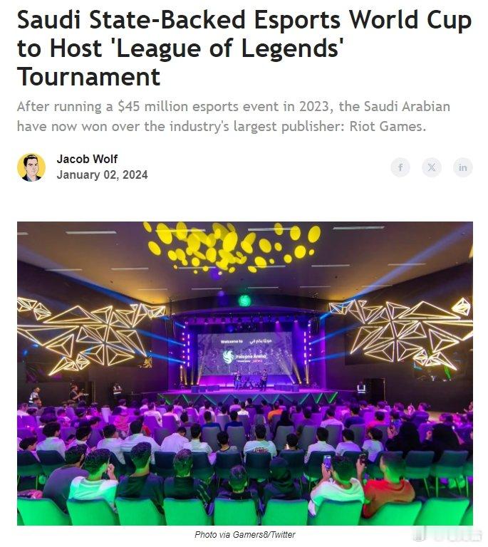 据国外媒体人Jacob Wolf爆料,今年在沙特首都利雅得举办的电竞世界杯将包括LOL项目。