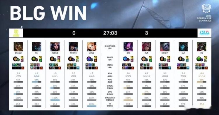 在刚刚结束的2023德玛西亚杯半决赛的比赛中,NIP以0-3不敌BLG惨遭淘汰,而整个系列赛NIP上单Shanji总战绩仅为1/15/9。值得一提的是和他对位的Bin总战绩为14/5/17