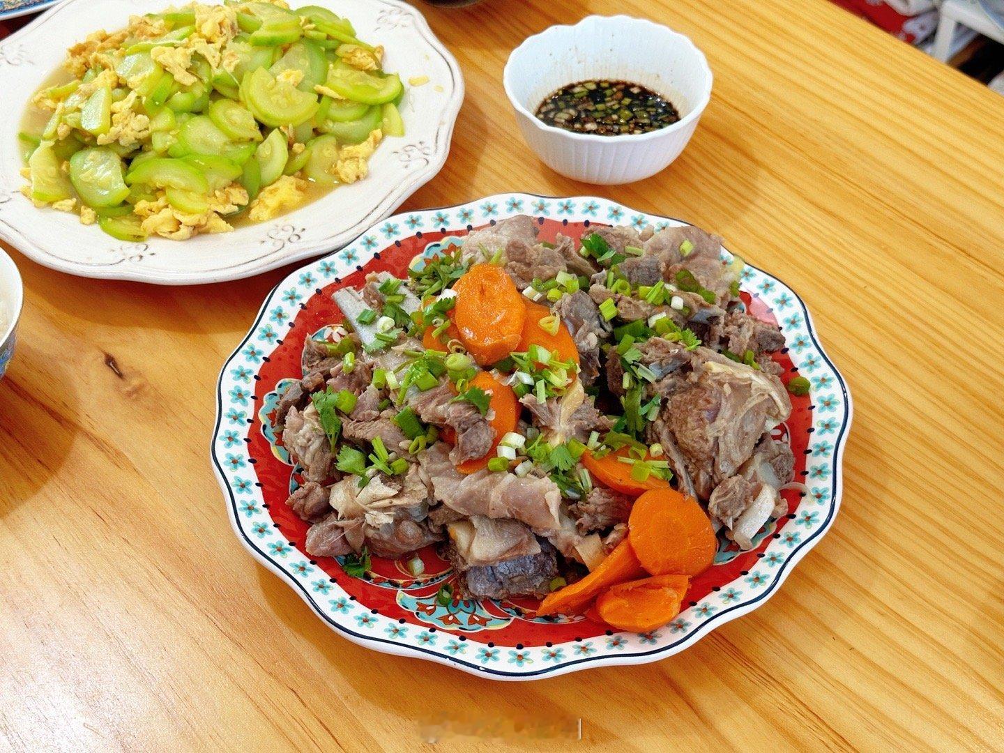 家里隐藏着大厨,不用我做饭了。家属的厨艺深藏不露,周末给我们做的酱焖猪蹄、清炖羊肉和西葫芦炒鸡蛋。分量十足,味道出众。