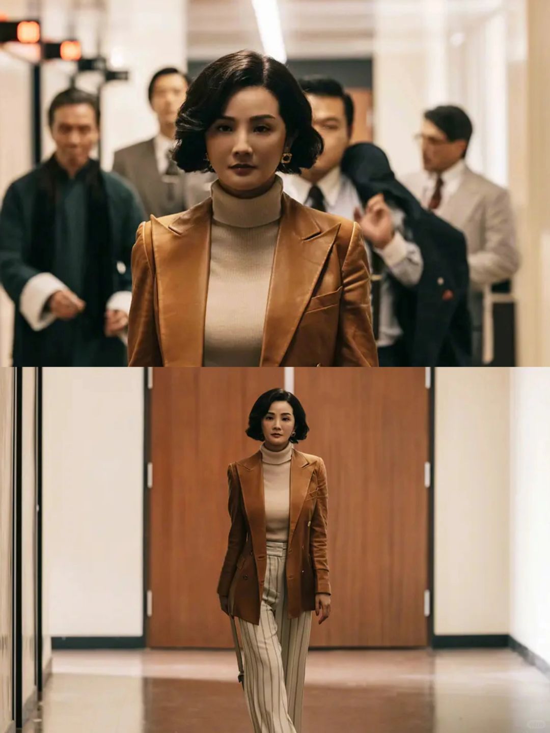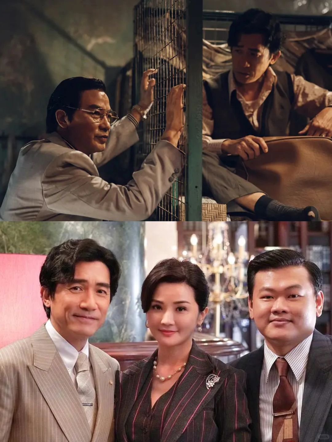 里面男性角色全员西装穿搭,但能看出梁朝伟的西装颜色较为张扬,西服较为花哨一些,超宽的枪驳头和大肩宽,突出了人物狂妄自傲的性格特质。