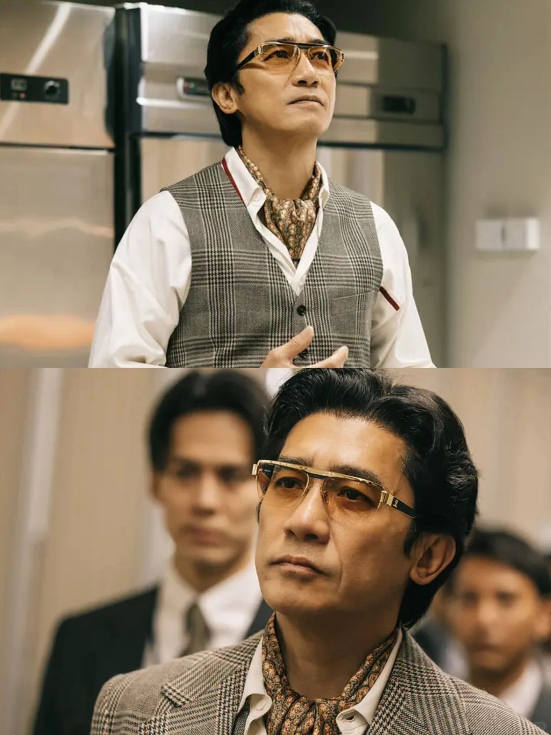 而刘德华呢则以银框眼镜为主,这一金一银,在电影里能让观众迅速辨别出各自阵营,也恰好借梁朝伟这个人物点题,突出“金”字的奢靡风。