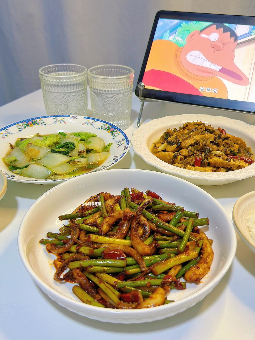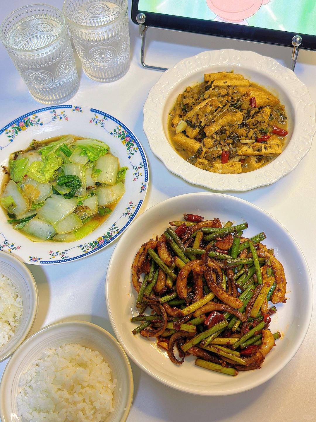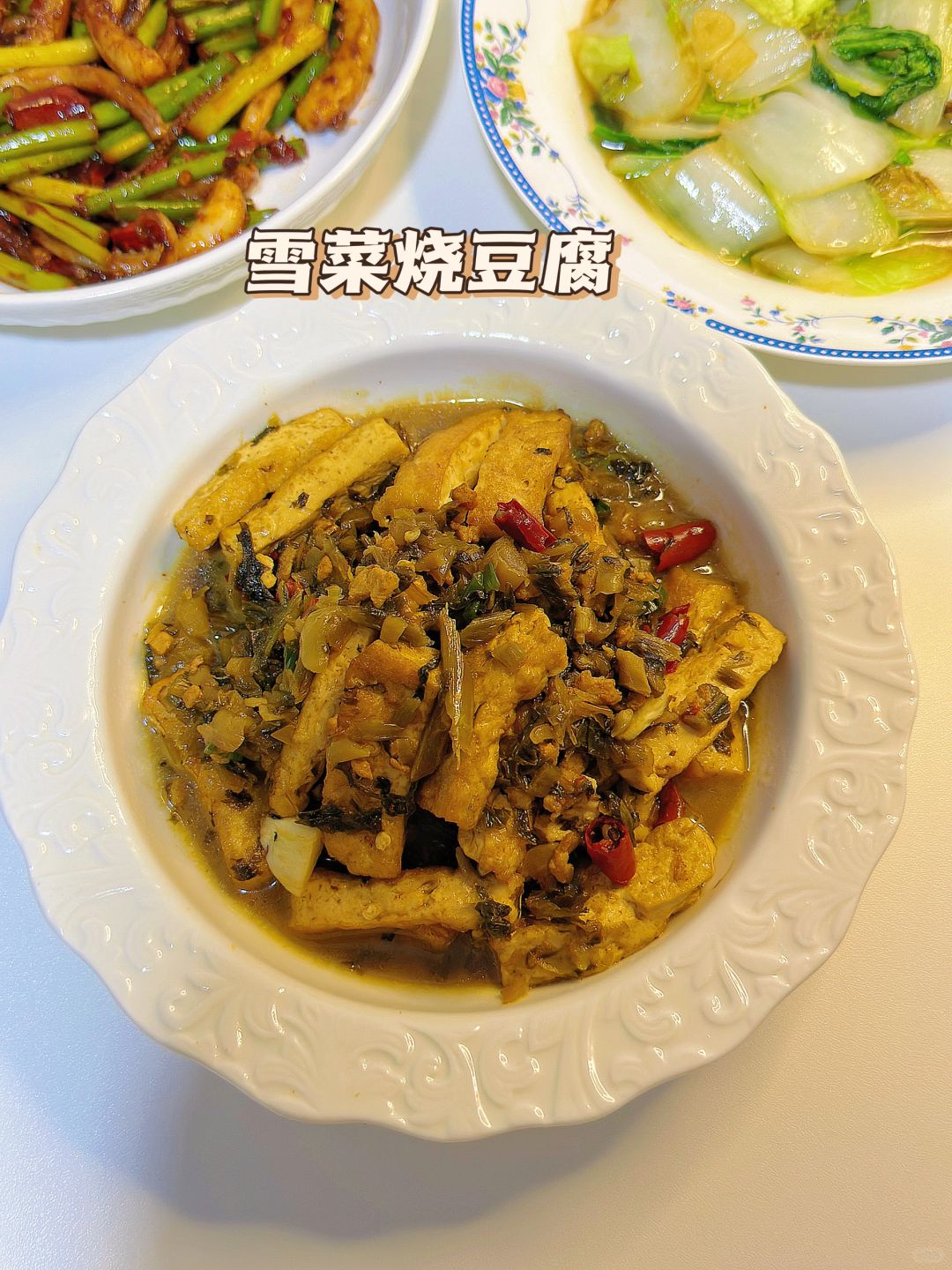 🎊雪菜烧豆腐太好吃了,腌制的雪菜超下饭,拌饭太香啦!白菜这样炒脆脆甜甜的超爽口~ 🌈今日菜单: 1️⃣蒜苔鱿鱼须 2️⃣雪菜烧豆腐 3️⃣清炒白菜