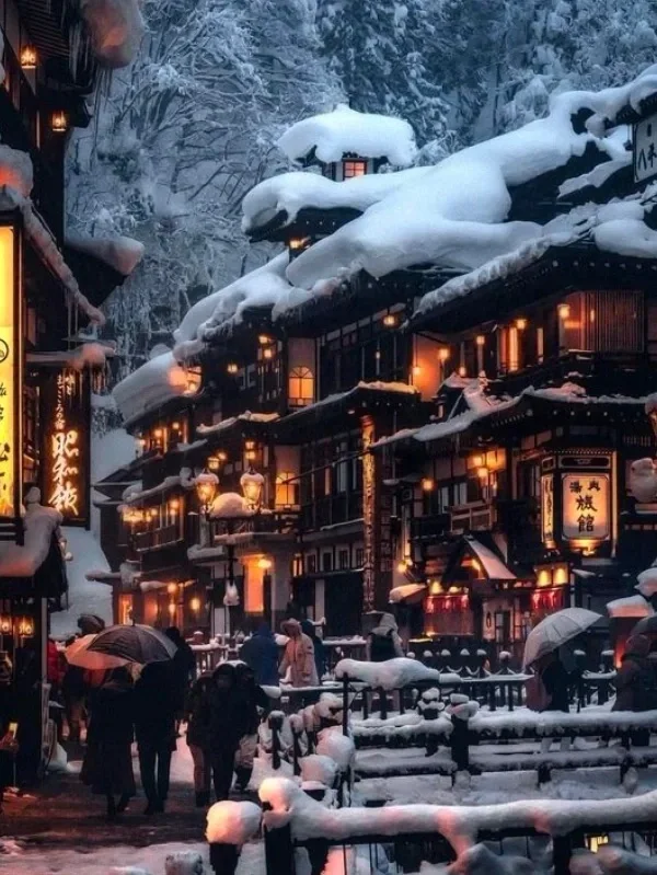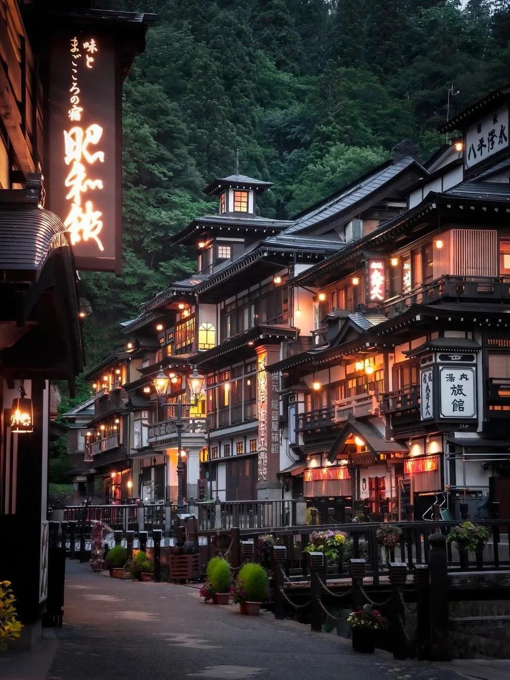 这是唯一距离东京比较远的打卡地,但还是想要推荐给大家,因为银山温泉拥有让人瞬间穿越时空一样的怀旧景色,尤其到傍晚,煤油灯亮起,充满怀旧的日本情趣。这里也被传说是《千与千寻》的灵感来源地