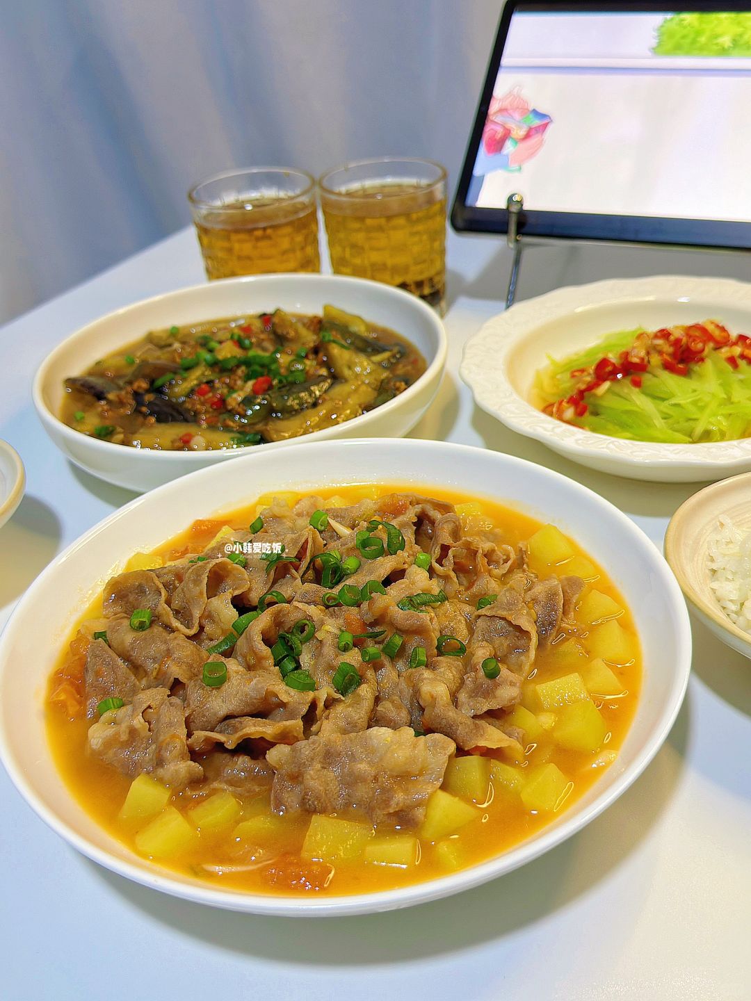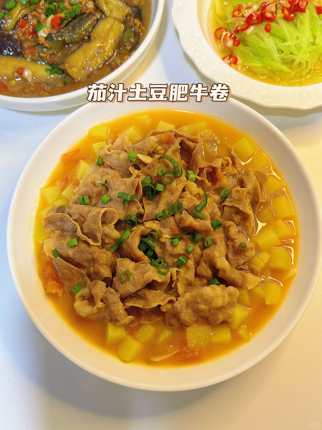 🎊酸溜溜的西红柿加上糯叽叽的土豆,一口汤➕一口肥牛卷,爽歪歪啦~还有肉沫茄子,拌起饭来香迷糊啦~ 🌈今日菜单: 1️⃣茄汁土豆肥牛卷🍅 2️⃣肉沫茄子🍆 3️⃣凉拌青笋丝