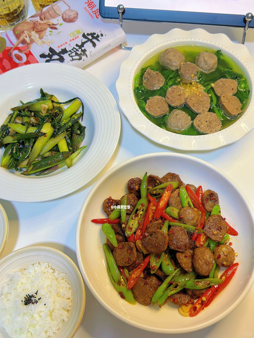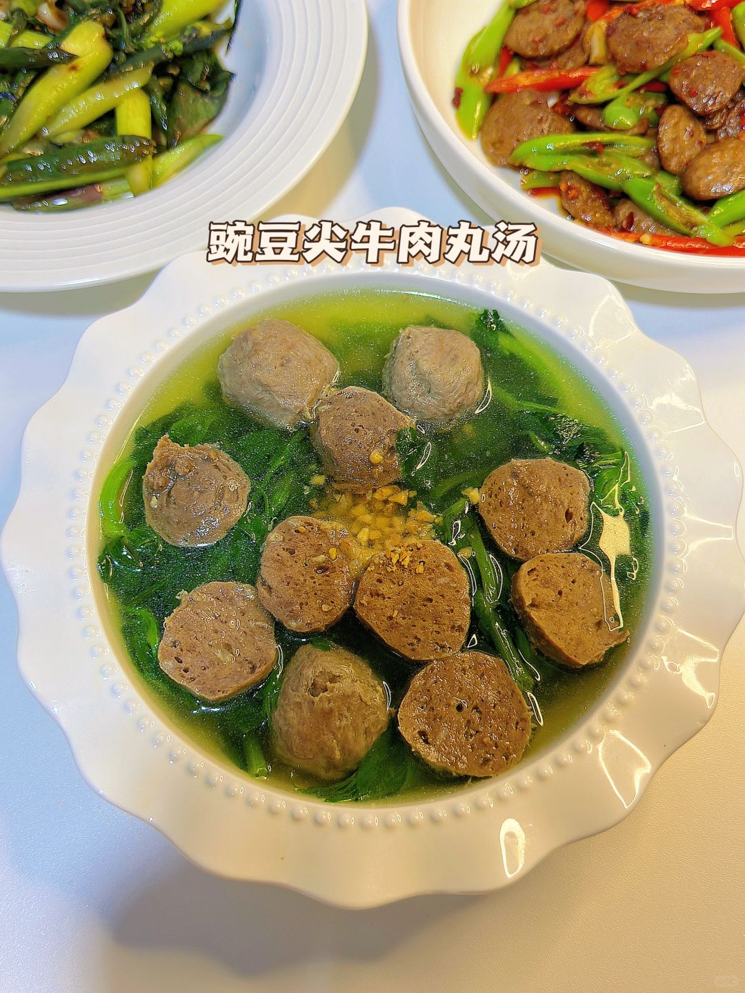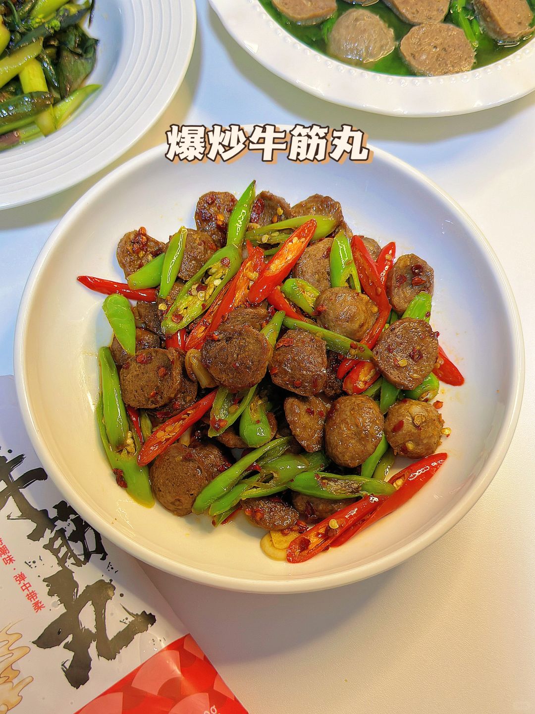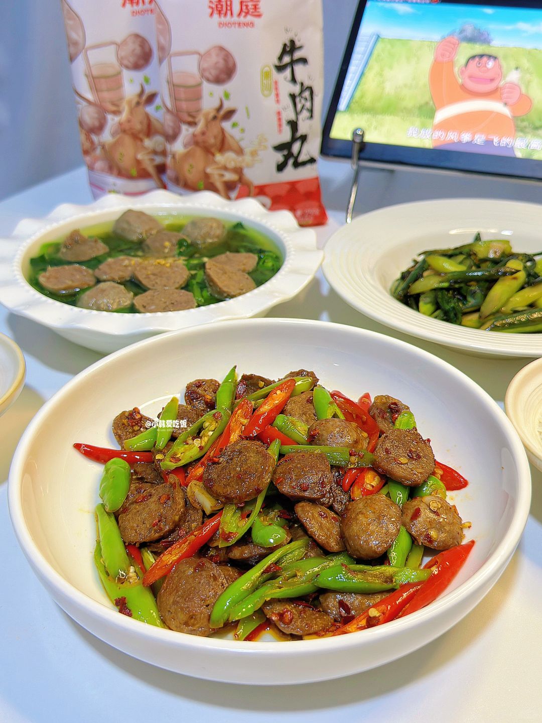 🎊今天的菜也太下饭啦!牛筋丸香香辣辣,Q弹劲道超下饭,还有饭搭子zui爱的牛肉丸~肉感满满,还会爆汁! 🌈今日菜单: 1⃣爆炒牛筋丸 2⃣豌豆尖牛肉丸汤 3⃣素炒红菜苔 🎊饭搭子每次吃火锅都吃不够牛肉丸,这次的潮汕牛肉丸简直买到了他的心巴上~回头再囤点牛肉丸,煮啥都方便~