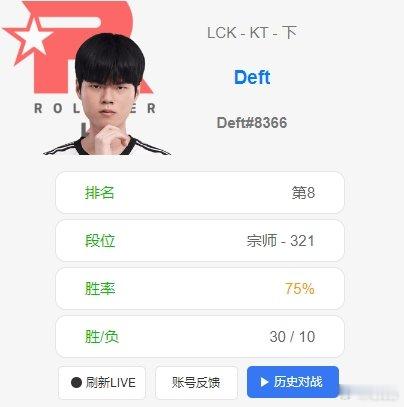 Deft新赛季状态依旧很出色啊,根据数据显示,KT的下路选手Deft新赛季目前在韩服以79%的超高胜率冲到了排行榜的第八位置。