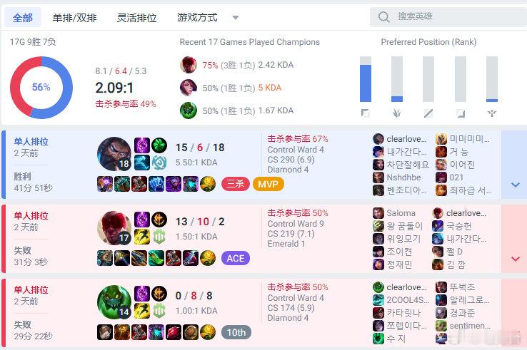 根据韩服排位统计小程序显示,Ale韩服账号游戏ID变成了clearlove14,根据之前Ale直播时使用的账号也能看出来Ale的ID。