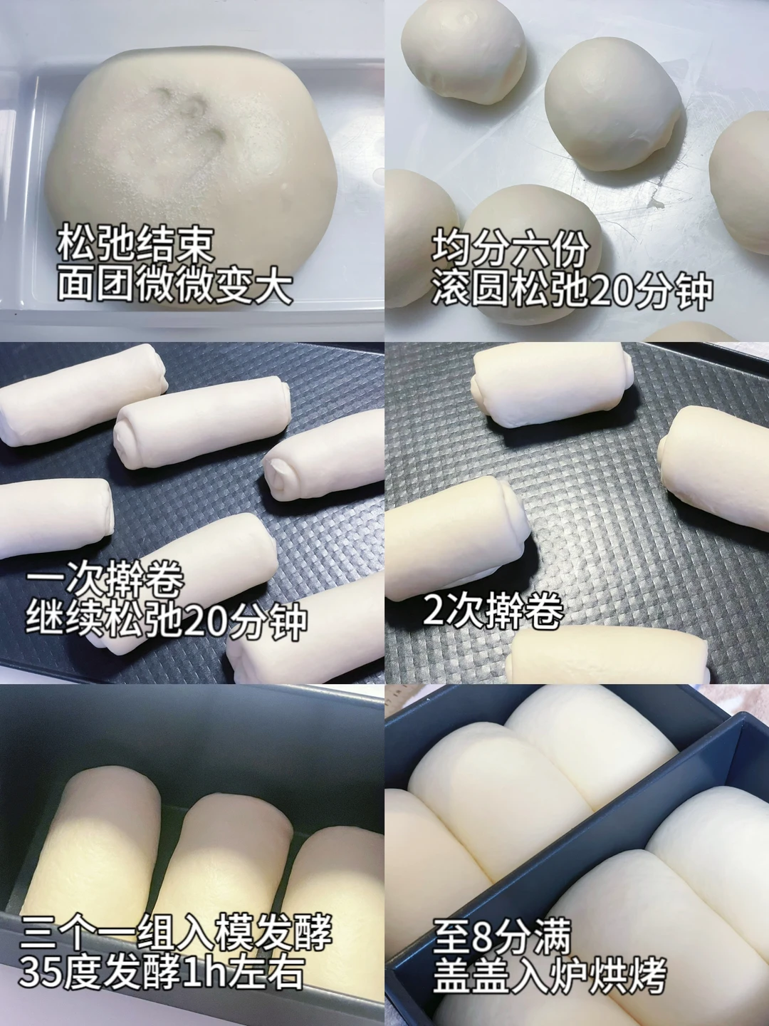 5⃣️一次擀卷,继续松弛20分钟;二次擀卷,3个一组入模,35度/80湿度发酵至8分满