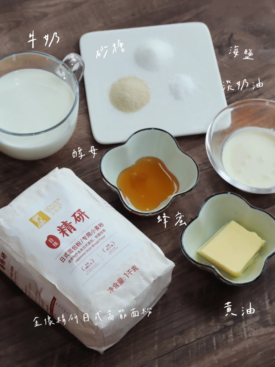 🥣主面团:金像精研日式高筋粉 150g|淡奶油120g|糖50g|盐6g|鲜酵母6g|奶粉20g|蜂蜜30g|黄油40g