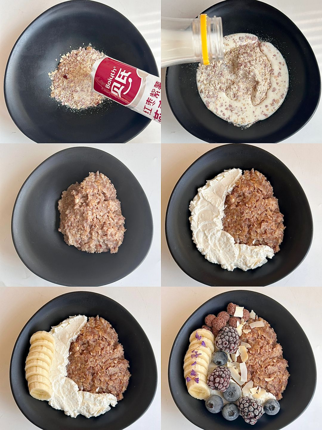 一人食吃什么 今日份早餐是又养生又快手的红枣燕麦酸奶碗🥣 十分钟就能搞定 红枣紫薯燕麦片倒入碗中 加入牛奶搅拌均匀 再加入希腊酸奶和水果装饰 营养健康又美味 小小一袋的燕麦片小巧又便携 一次一袋就饱腹感满满