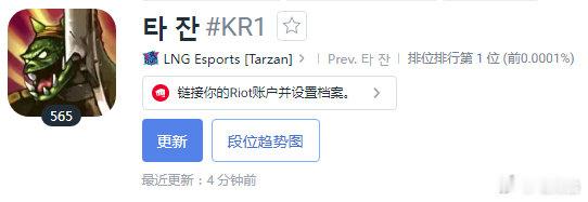 根据韩服排位统计小程序显示,韩服前十榜单更新,前LNG打野选手Tarzan以王者999分位列韩服第一,第二名为前FPX二队中单选手Qing王者903分,此外LPL选手还有ALY上单Lei、iG下路Ahn、TES辅助Meiko三人登上前十。