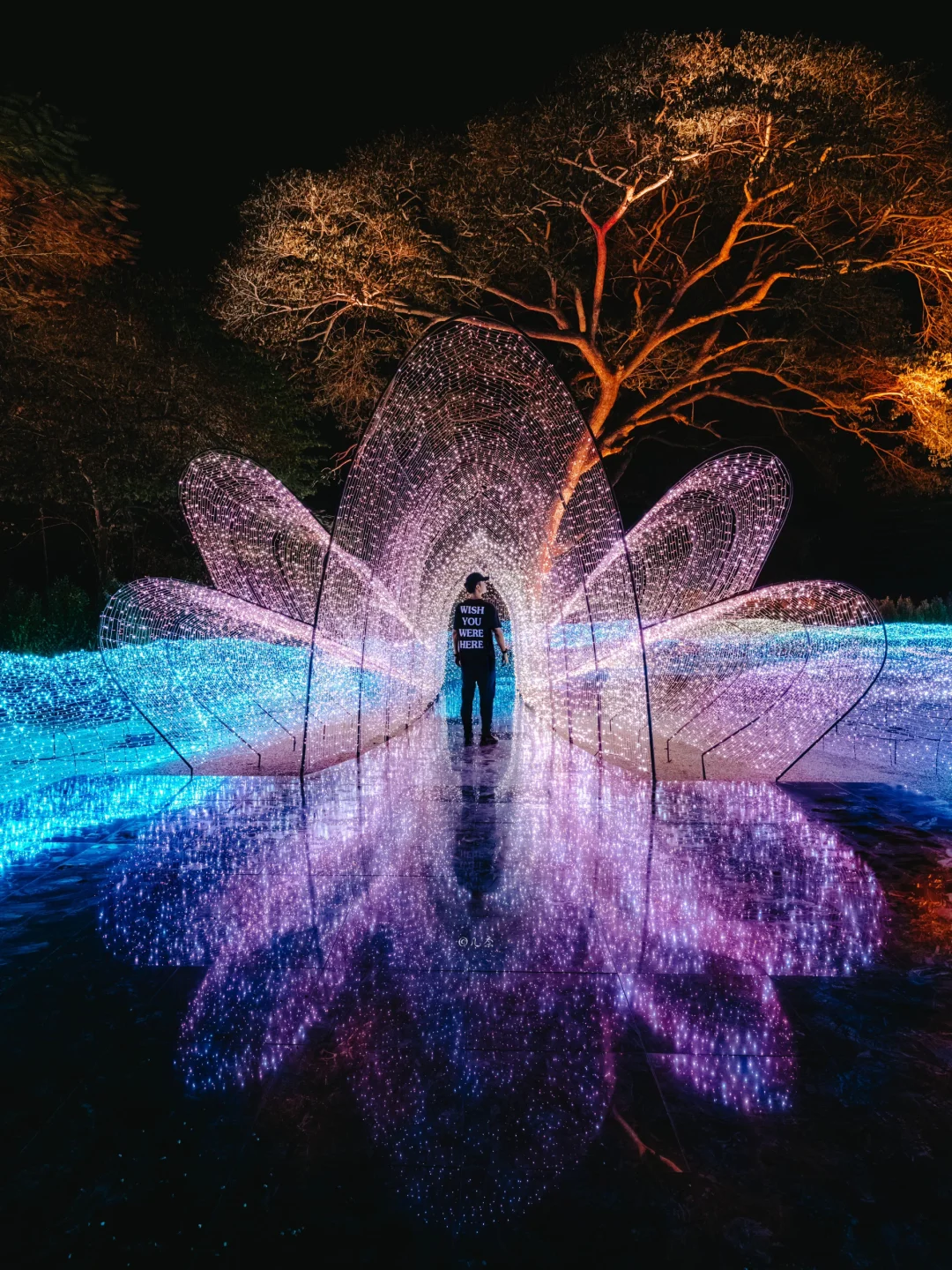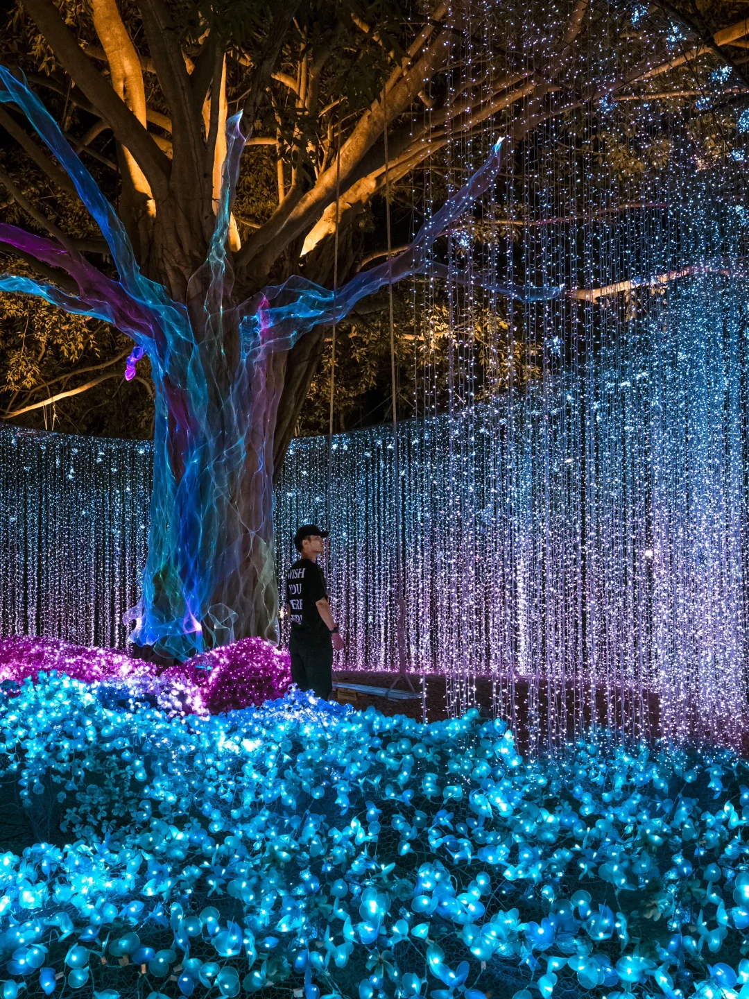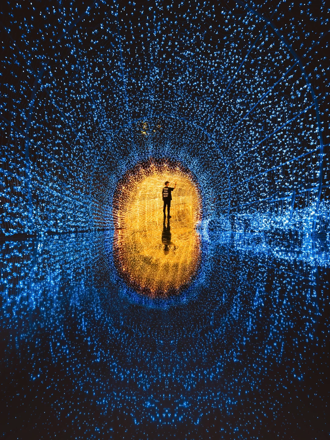 两端蓝色的灯中间黄色灯组成的灯光隧道