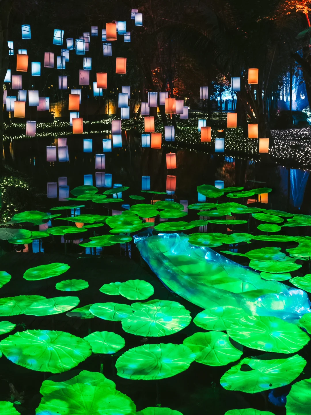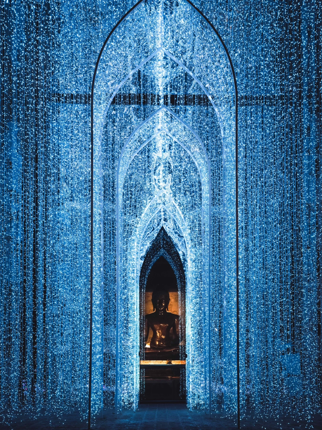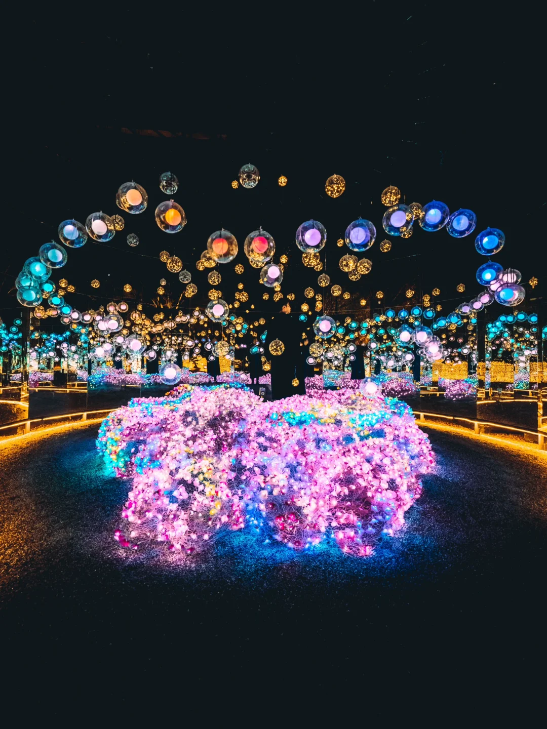 两端蓝色的灯中间黄色灯组成的灯光隧道