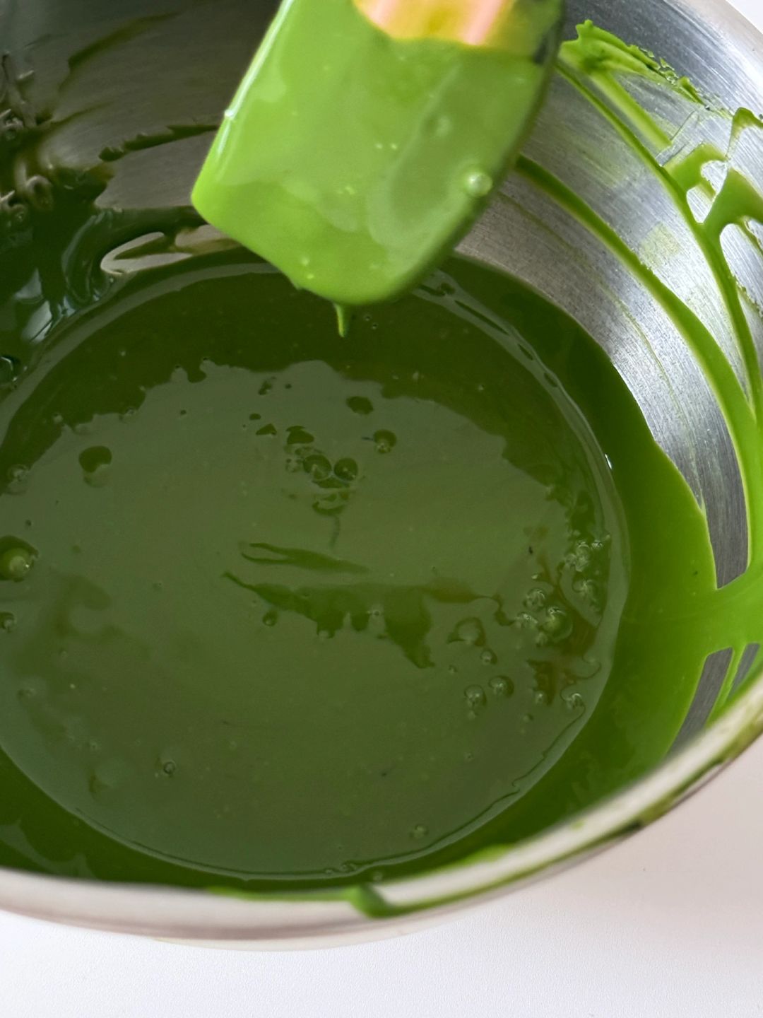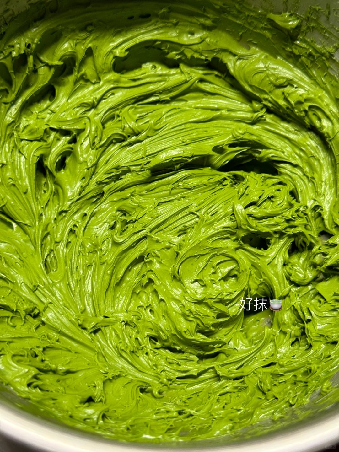 白巧克力隔水加热融化,加入抹茶粉搅拌成膏状
