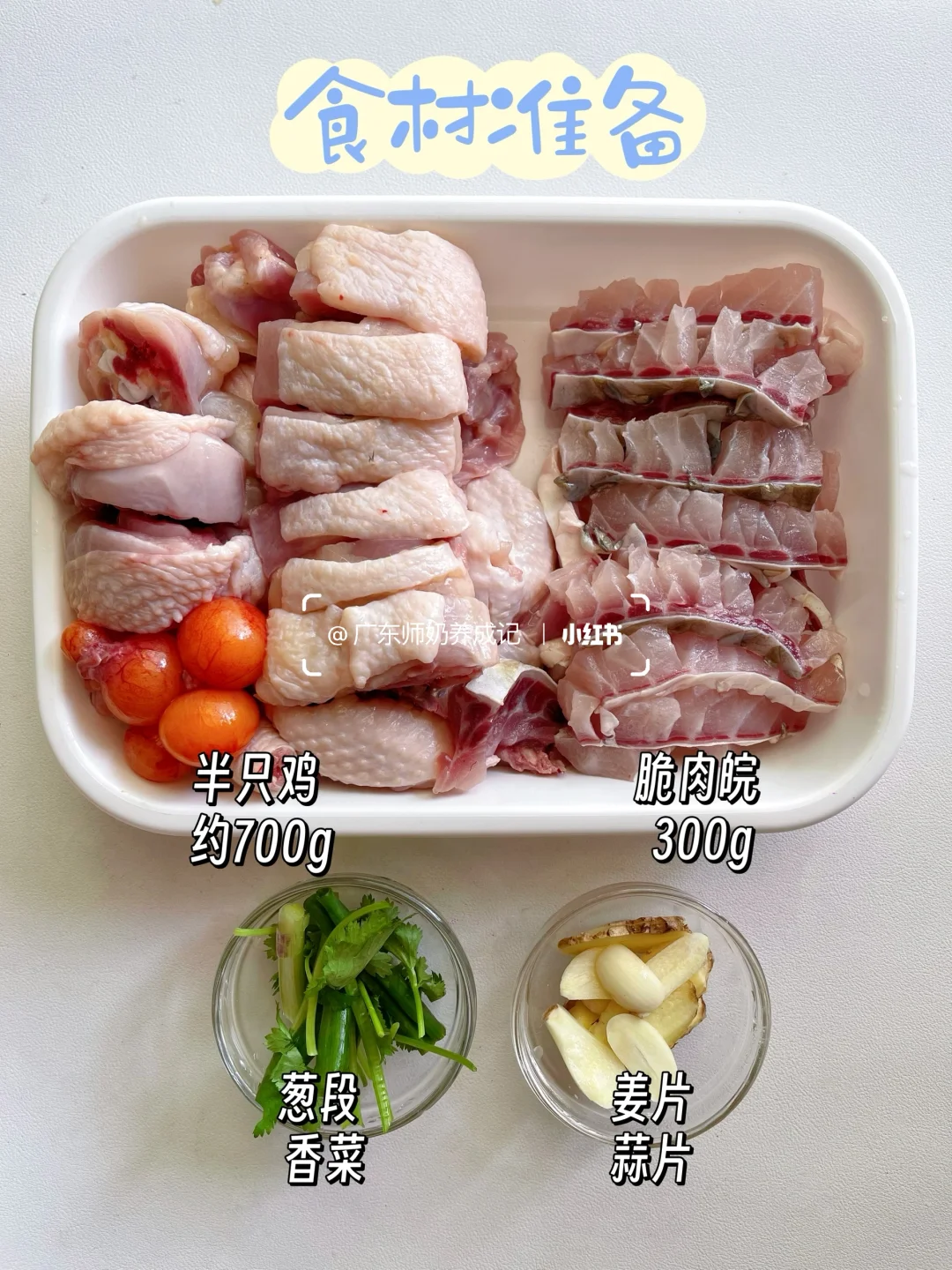 📝【食材】:鸡肉,脆肉鲩,姜葱蒜