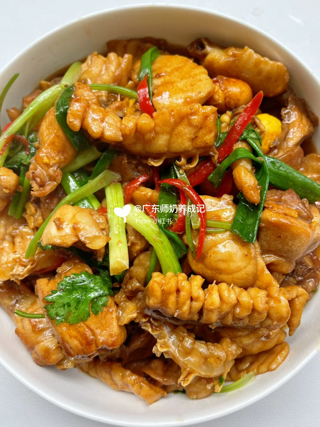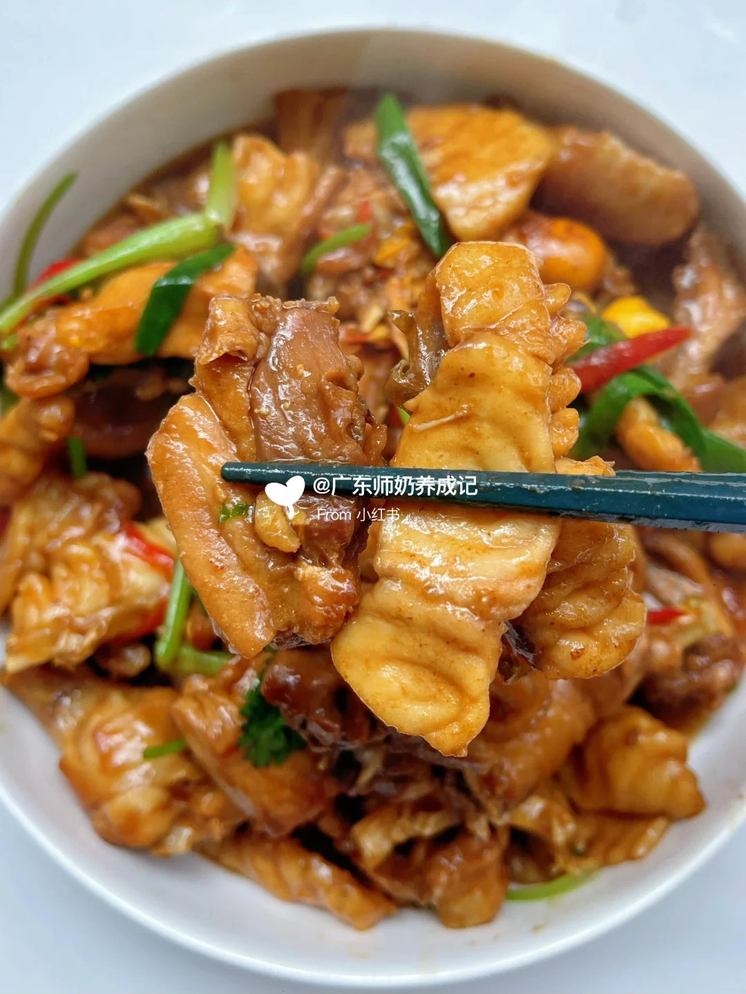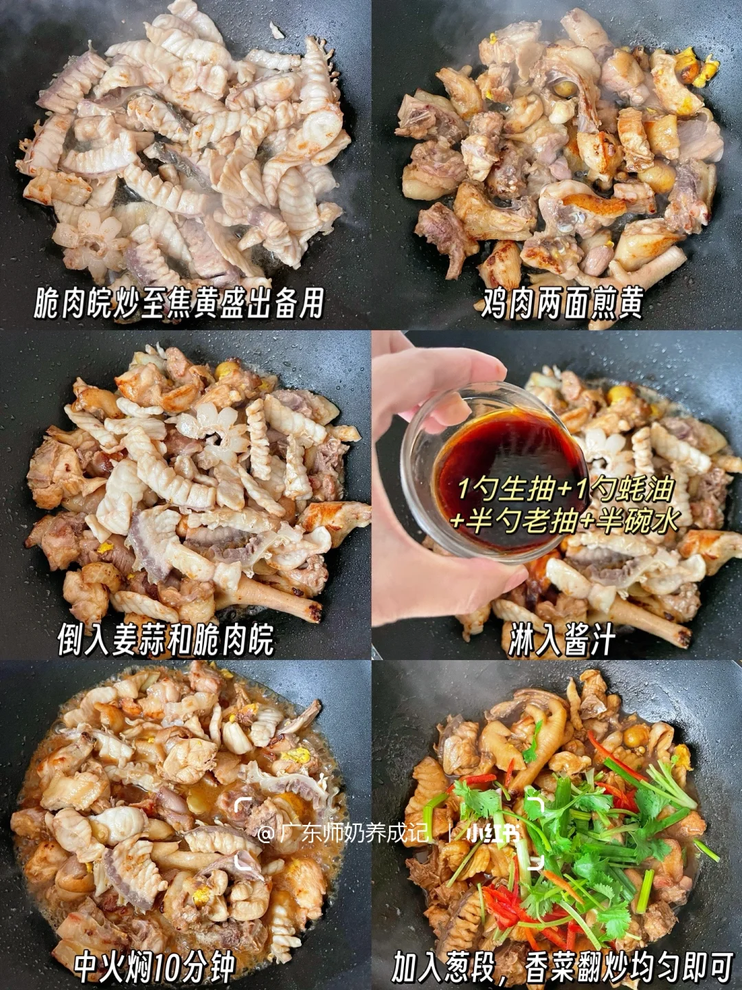 3️⃣留下底油把鸡肉煎黄,倒入姜蒜和脆肉鲩,加入半勺老抽➕1勺生抽➕1勺蚝油➕半碗水,中火焖10分钟,最后加入葱段和即可✅