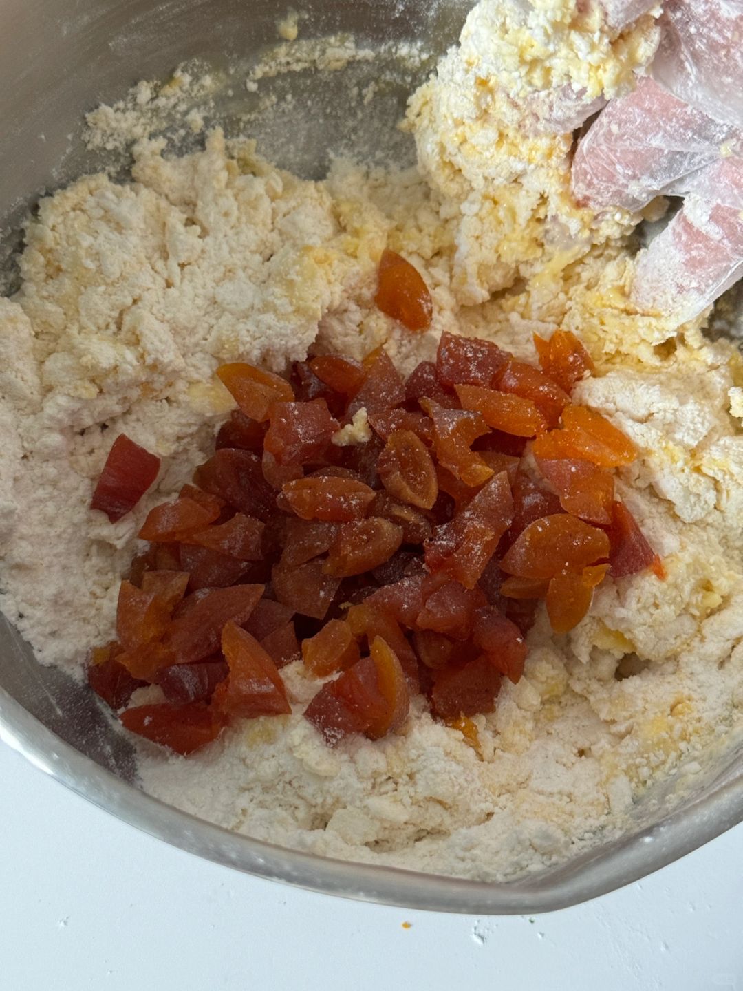 ⒊加入冰全蛋液+冰淡奶油+冰牛奶,加入提前剪成小块的柿饼,用手或者刮刀抓抓翻拌混匀