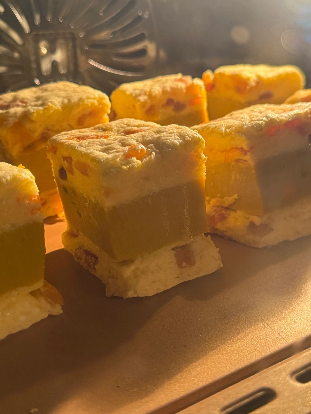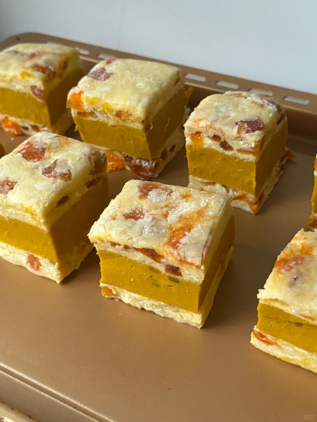 ⒍两份面团中间夹放南瓜馅,切割成9块,摆在烤盘上,烤箱提前预热180℃烘烤25分钟