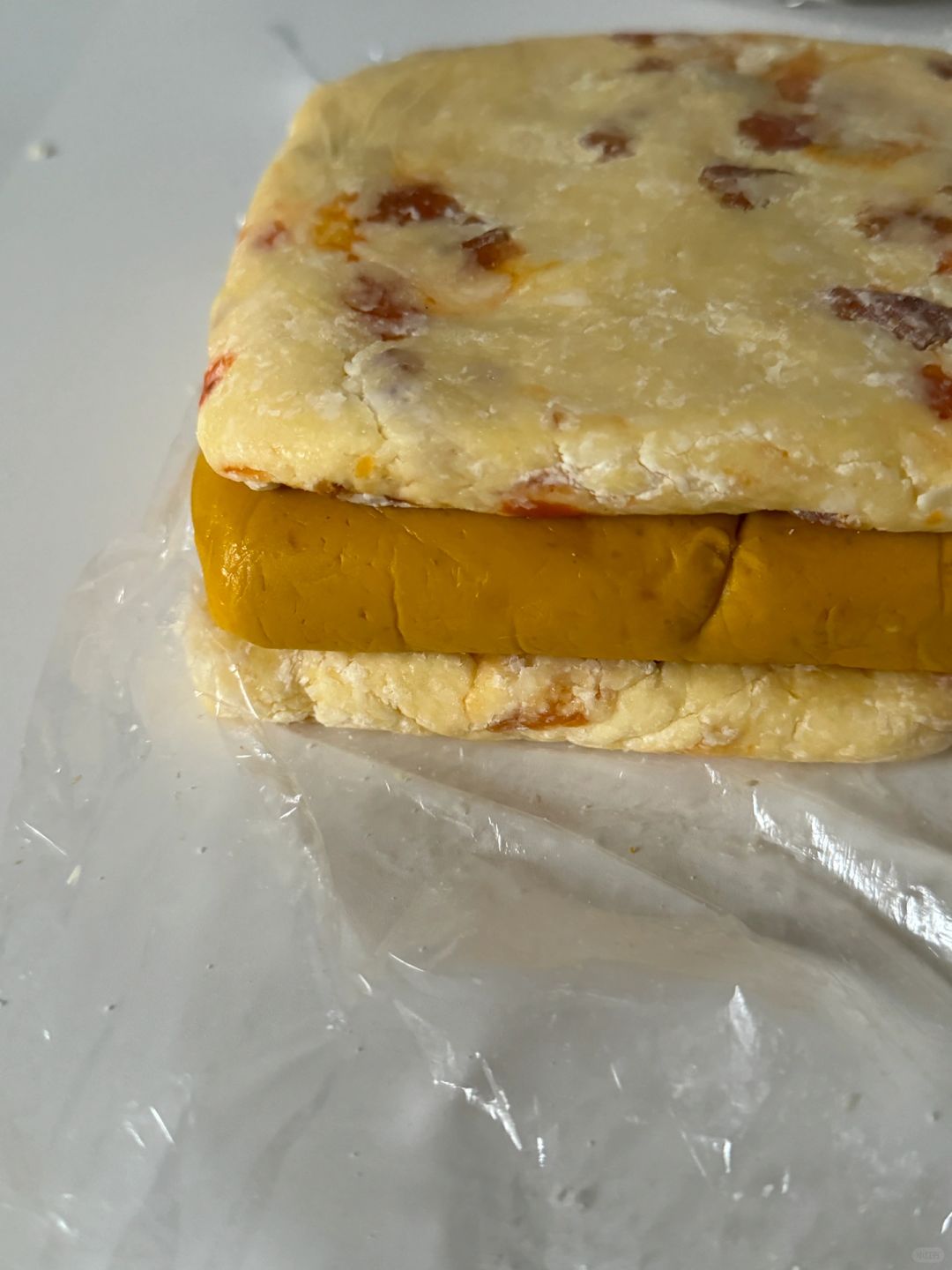 ⒌将面团分割成两份,用保鲜膜包裹,整形成大小一样的方形,放冰箱冷藏静置至少30分钟