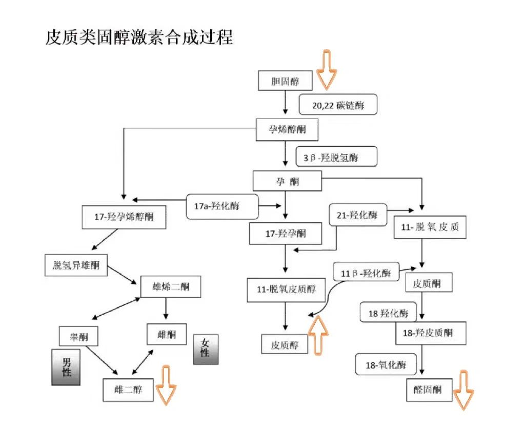 [庆祝R]其实我很早就想说这个话题,但对自己的表达能力没有自信,觉得自己讲不清楚这个事。上一篇笔记我提到单纯阴毛早现是肾上腺功能早现引起的,与性发育关系不到。要理解这个问题,我们首先要了解肾上腺在人体中的功能,肾上腺是体内重要的分泌腺体,负责生产多种类固醇激素。图片1是肾上腺皮质合成人体三种类固醇激素的通路: