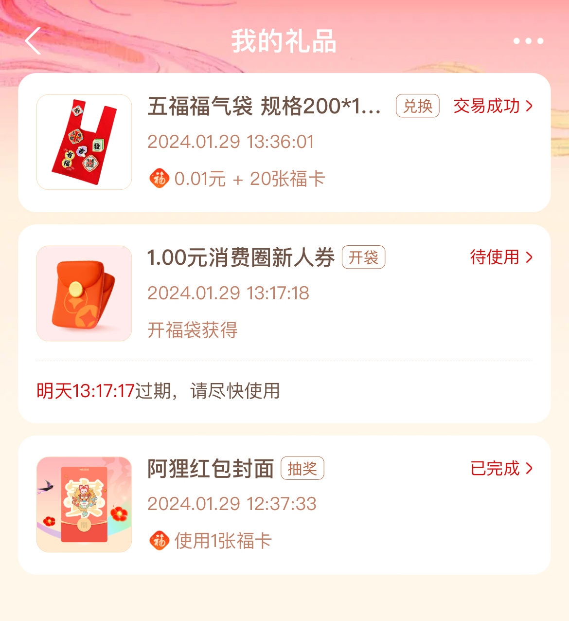 今年运气还不错,第一天就扫到一张“敬业福”,还用20张福卡兑换了一个🧧袋✌️