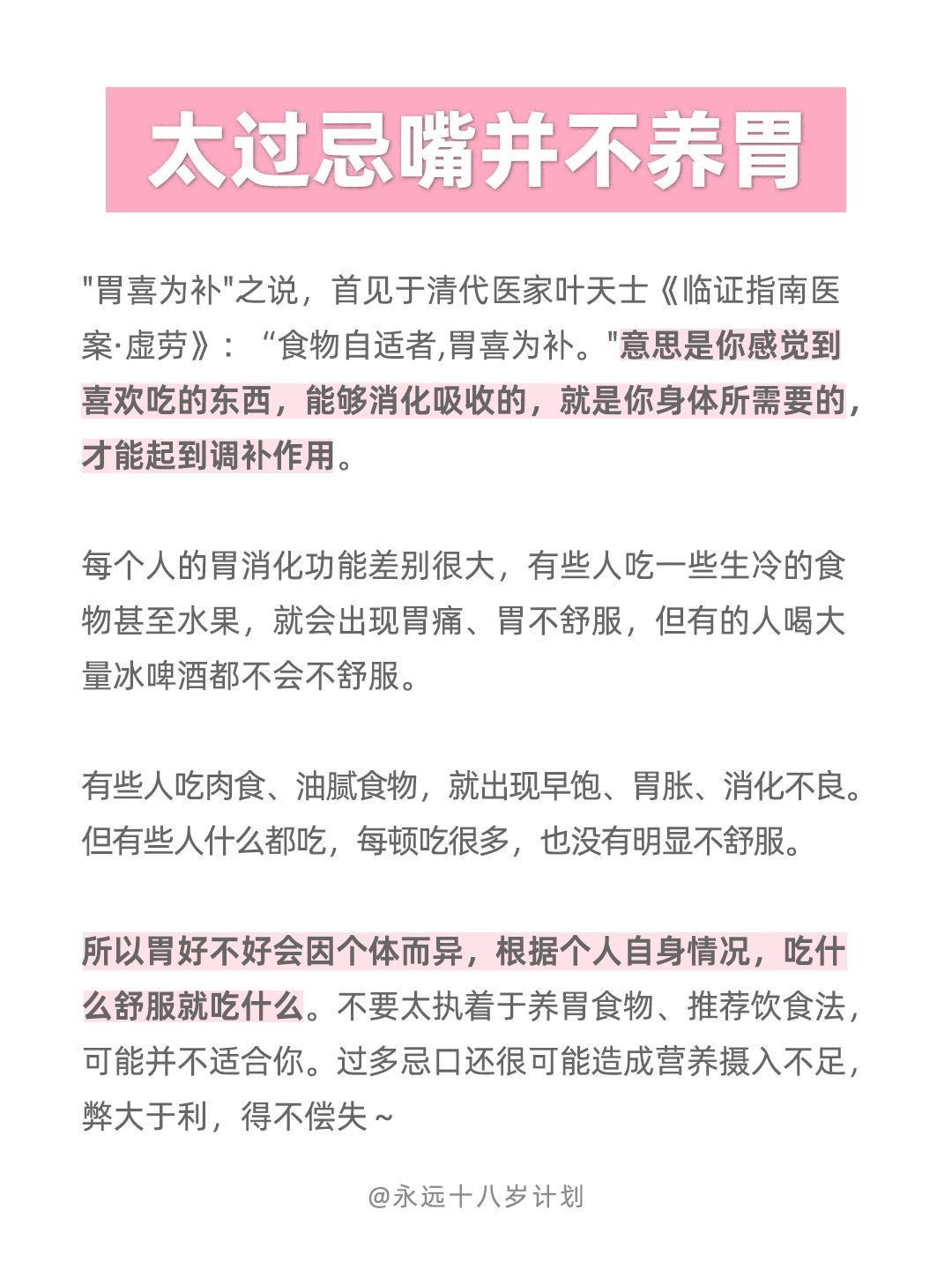 胃以喜为补!就是说你感觉到自己身体喜欢的,接受的,吃了胃舒服的,都是对自己身体好的,所以放心吃喜欢的吧~ 但要注意,“胃喜”跟“口喜”不是一个概念,“口喜”是指某些饮食偏好,千万不要混淆啦。