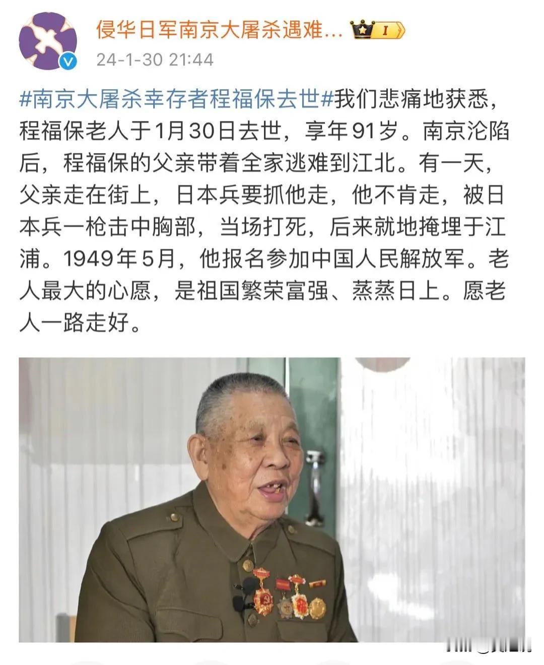 南京大屠杀幸存者程福保,于1月30日凌晨离世,享年91岁。 在1937年南京沦