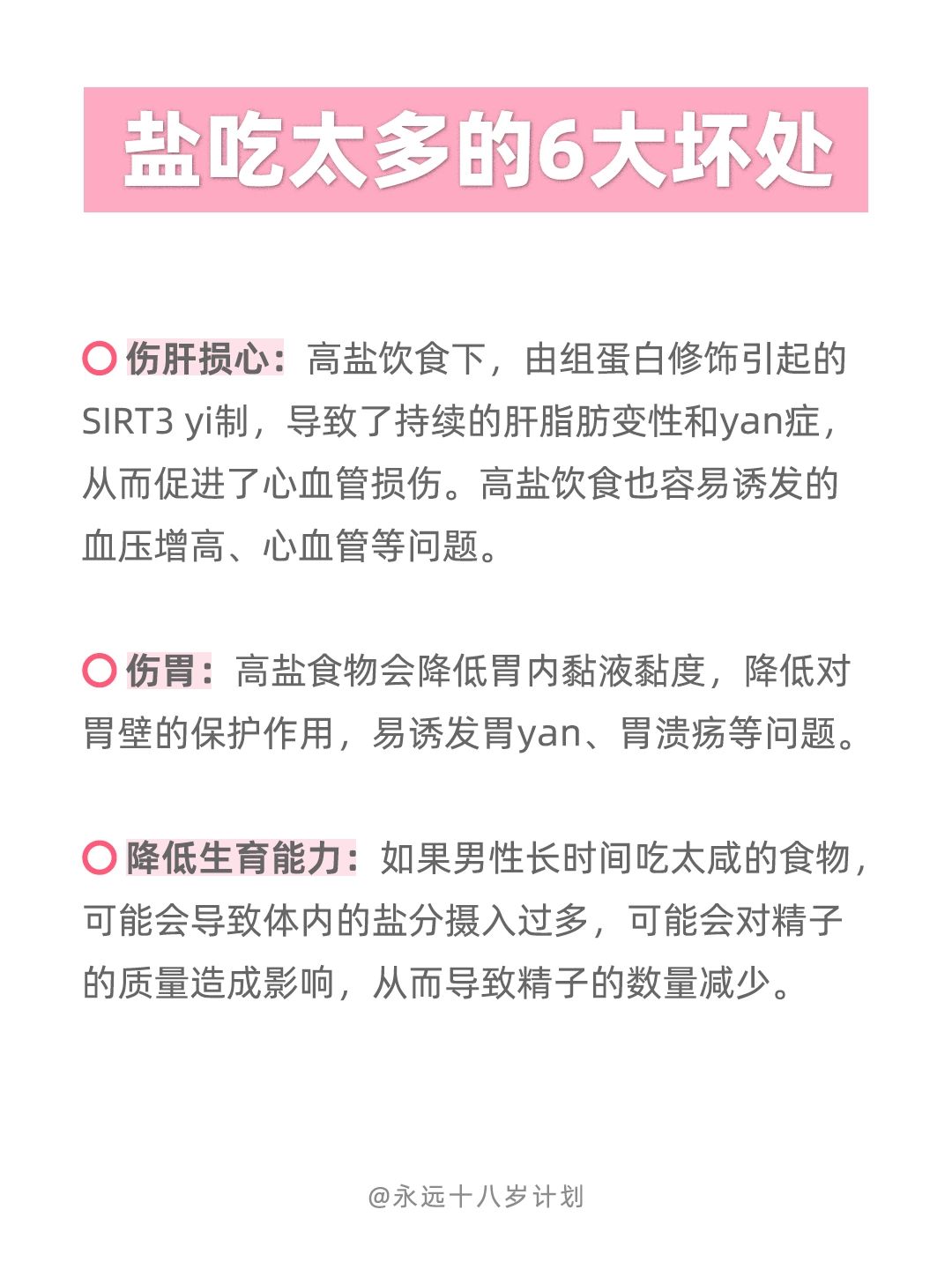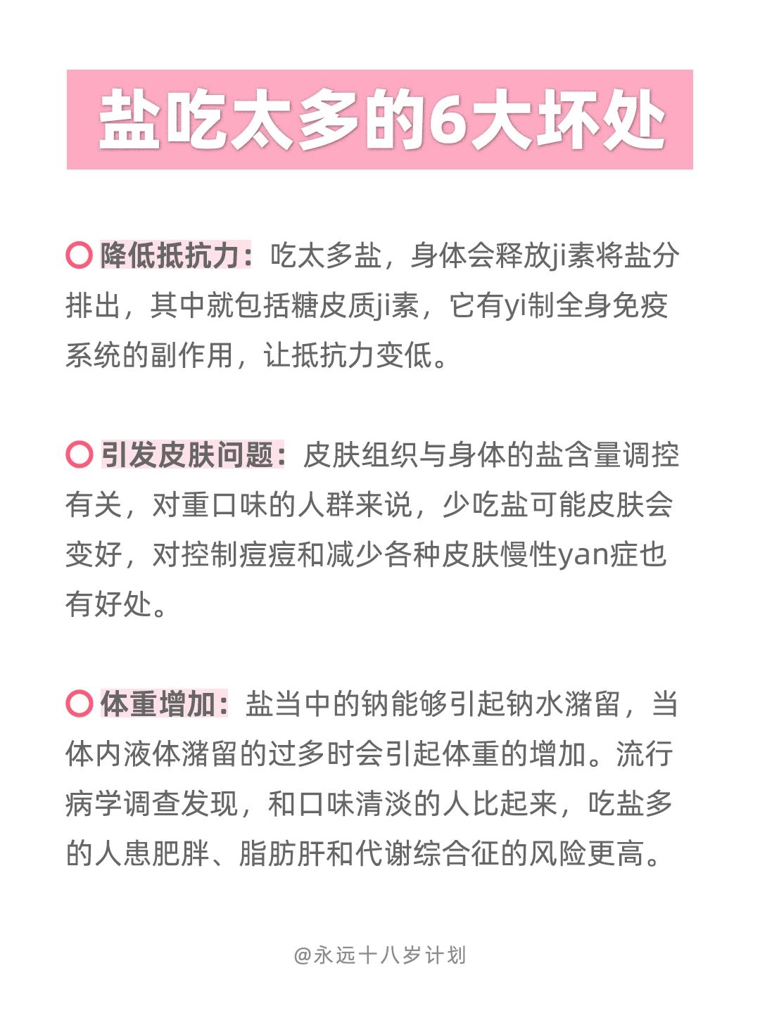 大家一直以来都被灌输的是抗糖护肤,糖吃多了皮肤老化快,但其实盐也是皮肤不喜欢的噢!不仅如此 ,吃太多盐还会降低抵抗力,体重增加.... 所以宝子们,以后不仅要少糖,还要少盐噢~