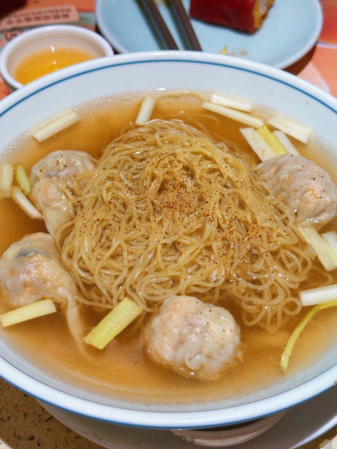 云吞面,云吞里好大的虾仁,撑得满满的,我喜欢碱水面的爽滑。