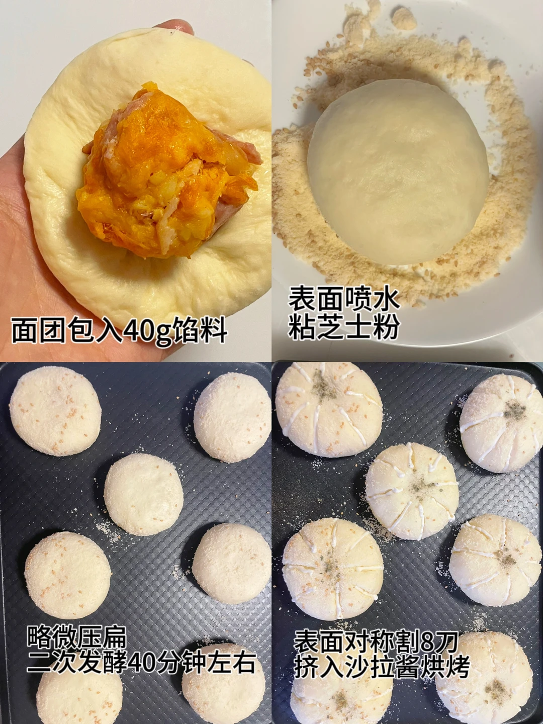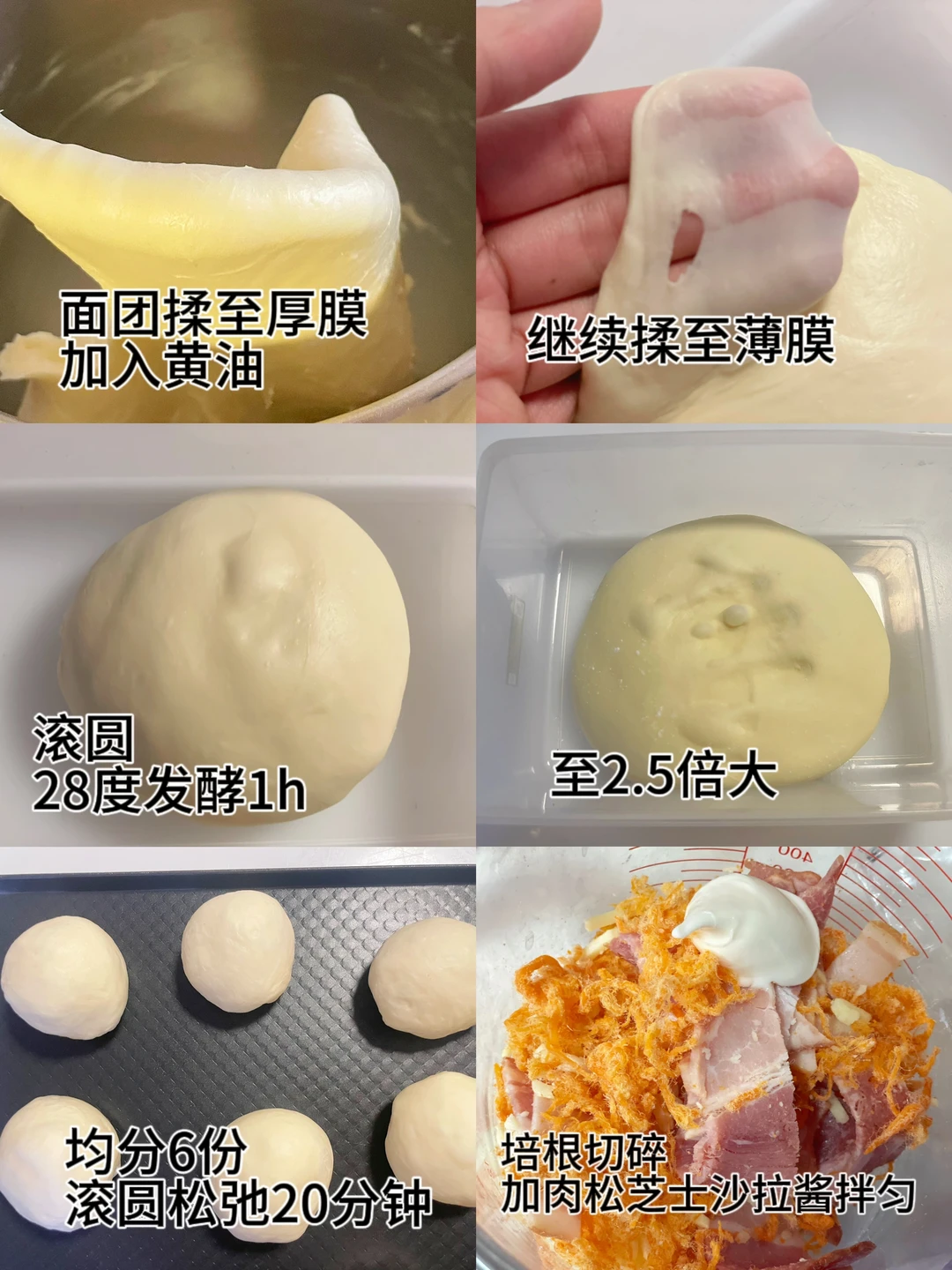 夹馅🥣:培根4片|肉松150g|沙拉酱30g|马苏里拉芝士碎50g