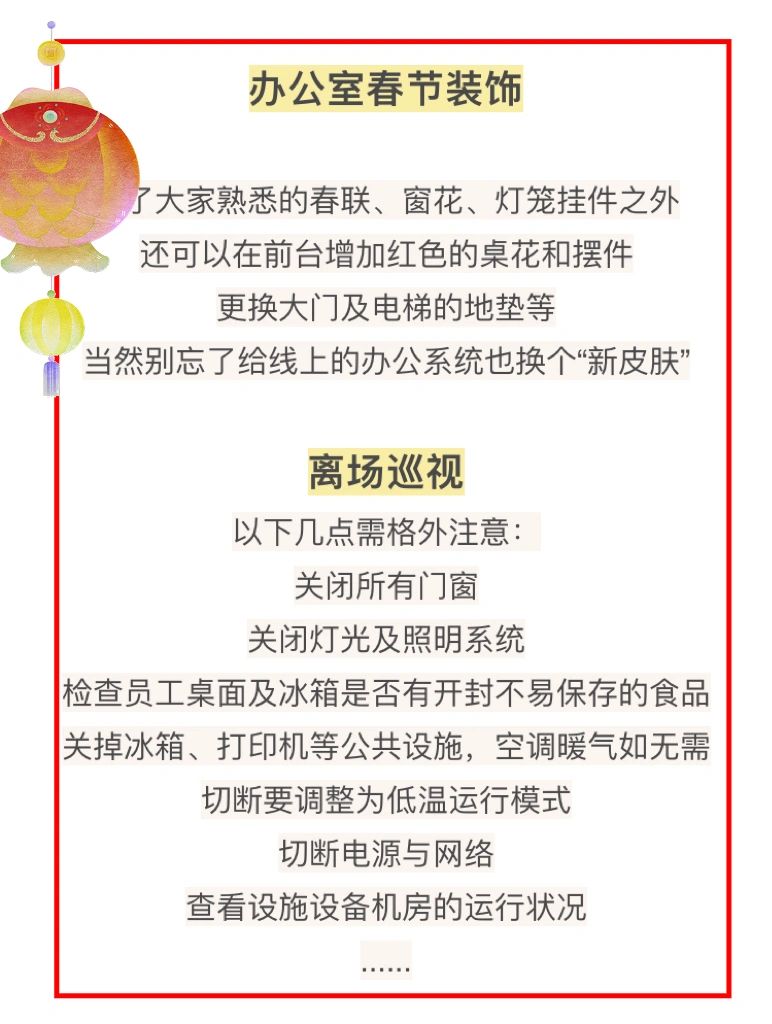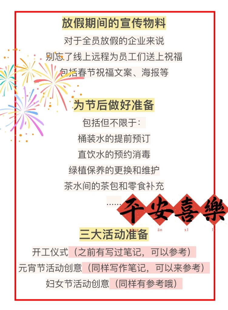距离春节越来越近了,但行政要忙的事情还是很多 虽然放假前的这段时期,行政的精力主要都集中在年会上,但是别忘了下面这些工作也同样重要,赶紧来查漏补缺!