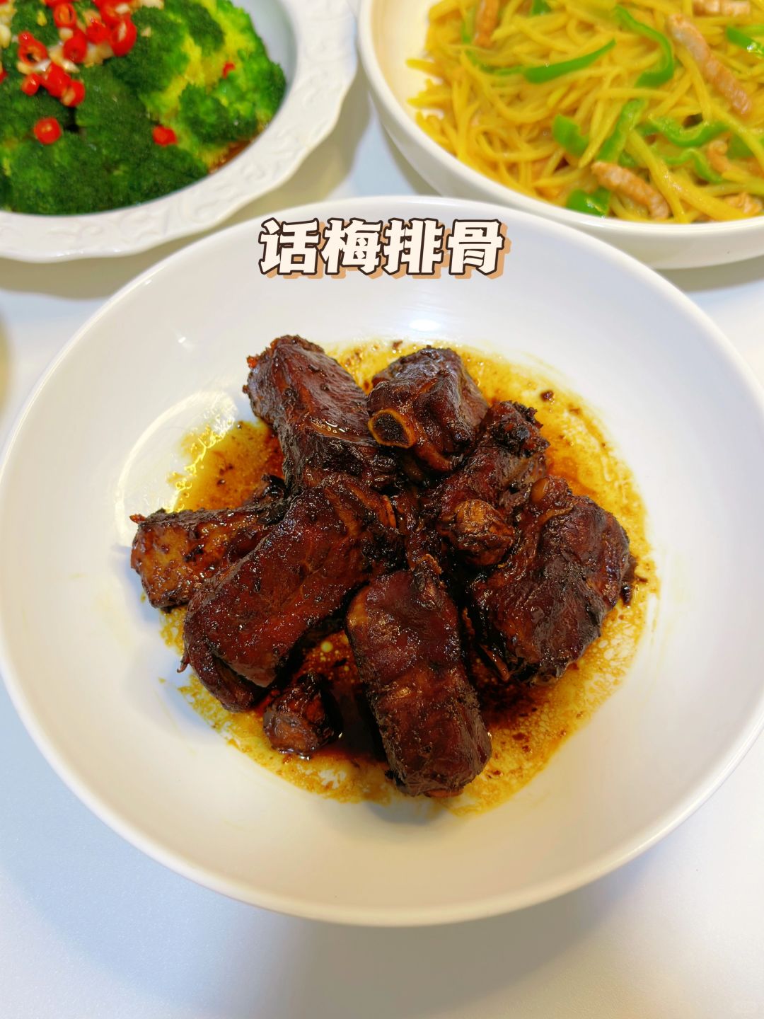 🎊话梅排骨今天的颜色有点深,但是一点也不耽误他好吃呀!酸酸甜甜的话梅味全浸入到排骨里面了,排骨炖的软糯脱骨,真的太好吃啦~ 🌈今日菜单: 1️⃣话梅排骨 2️⃣青椒土豆丝 3️⃣白灼西兰花