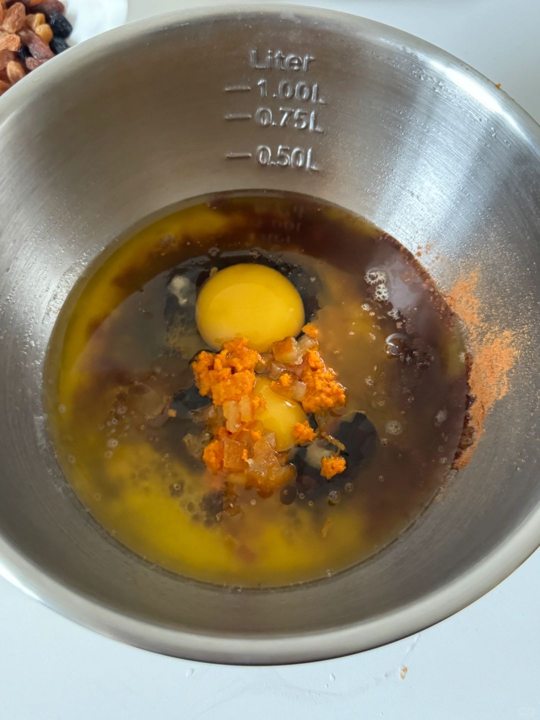 融化的黄油+鸡蛋+红糖+橙汁+肉桂粉+肉豆蔻搅匀