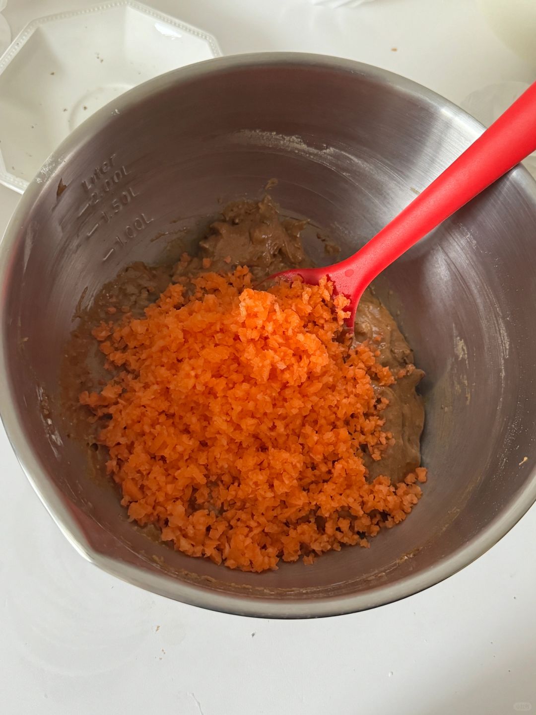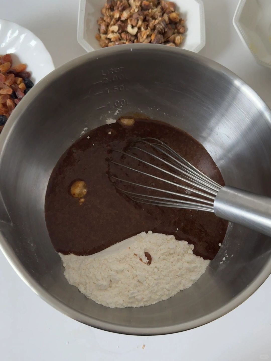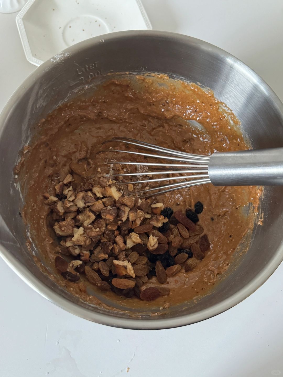 两者混合搅匀,加入烤核桃葡萄干胡萝卜碎搅匀